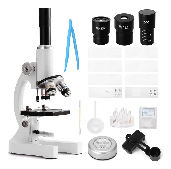 O Microscópio Monocular Biológico Profissional 64x A 2400x vem com um microscópio, 2 oculares, um extensor (2x), uma luz de preenchimento e um conjunto de ferramentas de acessórios.