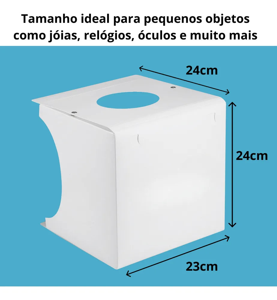 Dimensões perfeitas DO MINI ESTUDIO FOTOGRAFICO para pequenos produtos: 23 x 24 x 23 cm – ideal para joias, acessórios, brinquedos, relógios, gadgets e muito mais!