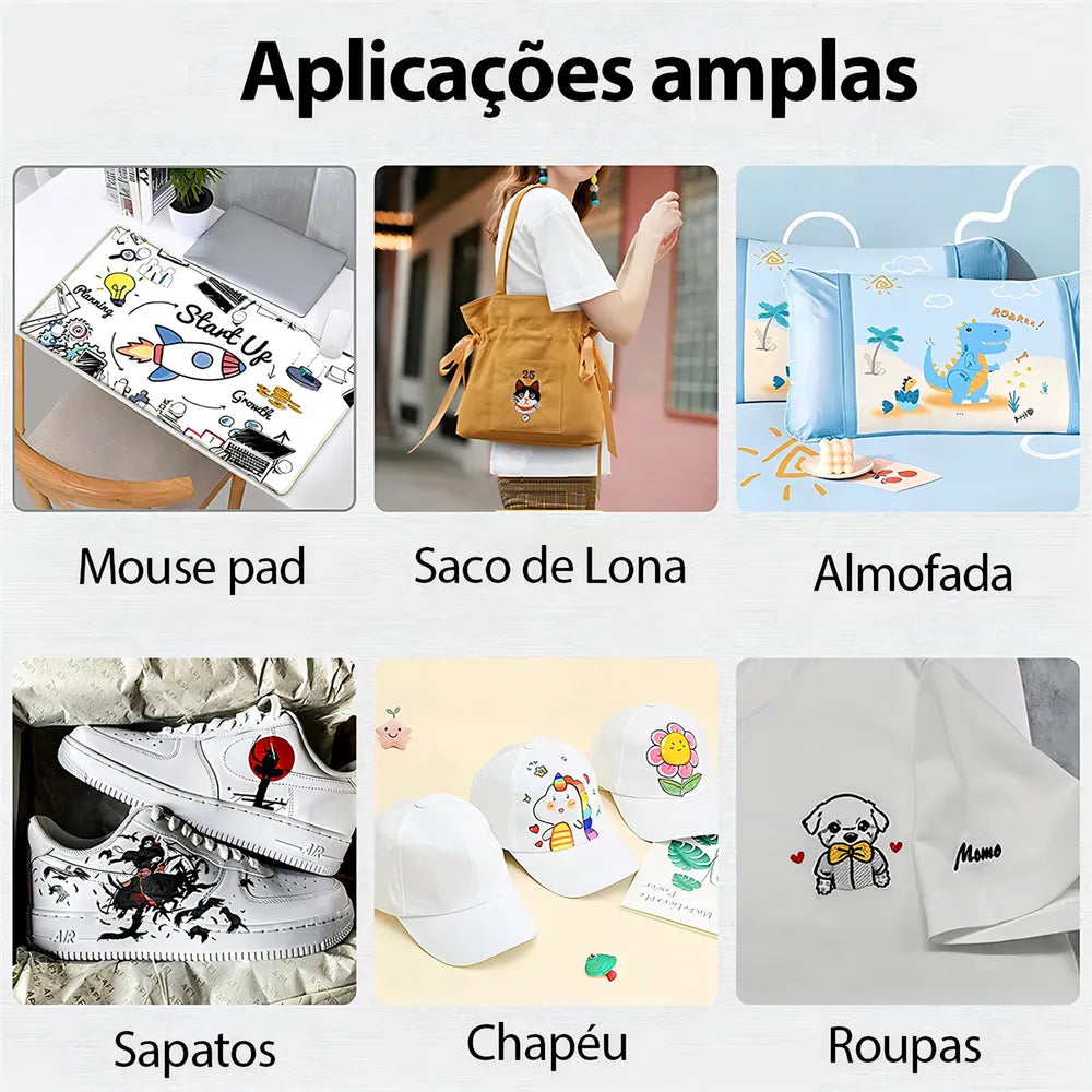 Ideal para para Tênis, bonés, chapéus, locais curvos, mangas de camisas e camisetas, acabamentos em locais onde não é possível aplicar transfers com a prensa plana comum.