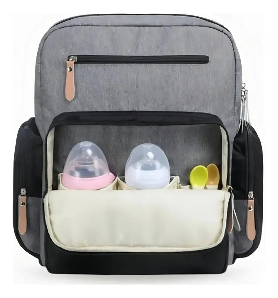 - 5 bolsos frontais, sendo um térmico para mamadeiras e para 3 talheres.