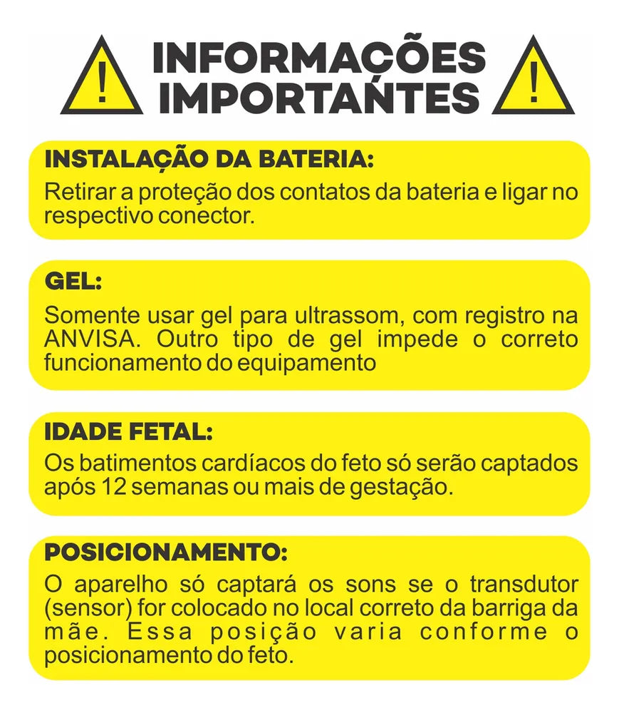 Com este contato próximo desde as primeiras semanas de gestação é estabelecida uma conexão ainda maior com bebê, podendo assim a mãe, o pai e os seus familiares sentirem a presença dele. Além do monitor, acompanha 1 manual de instruções, 1 fone de ouvido, 1 cabo de gravação para registrar o som do batimento cardíaco do feto, 1 gel clínico e 1 bateria de 9V.