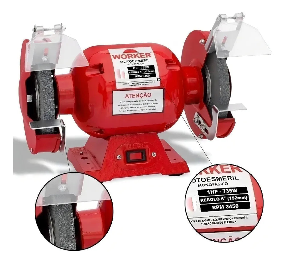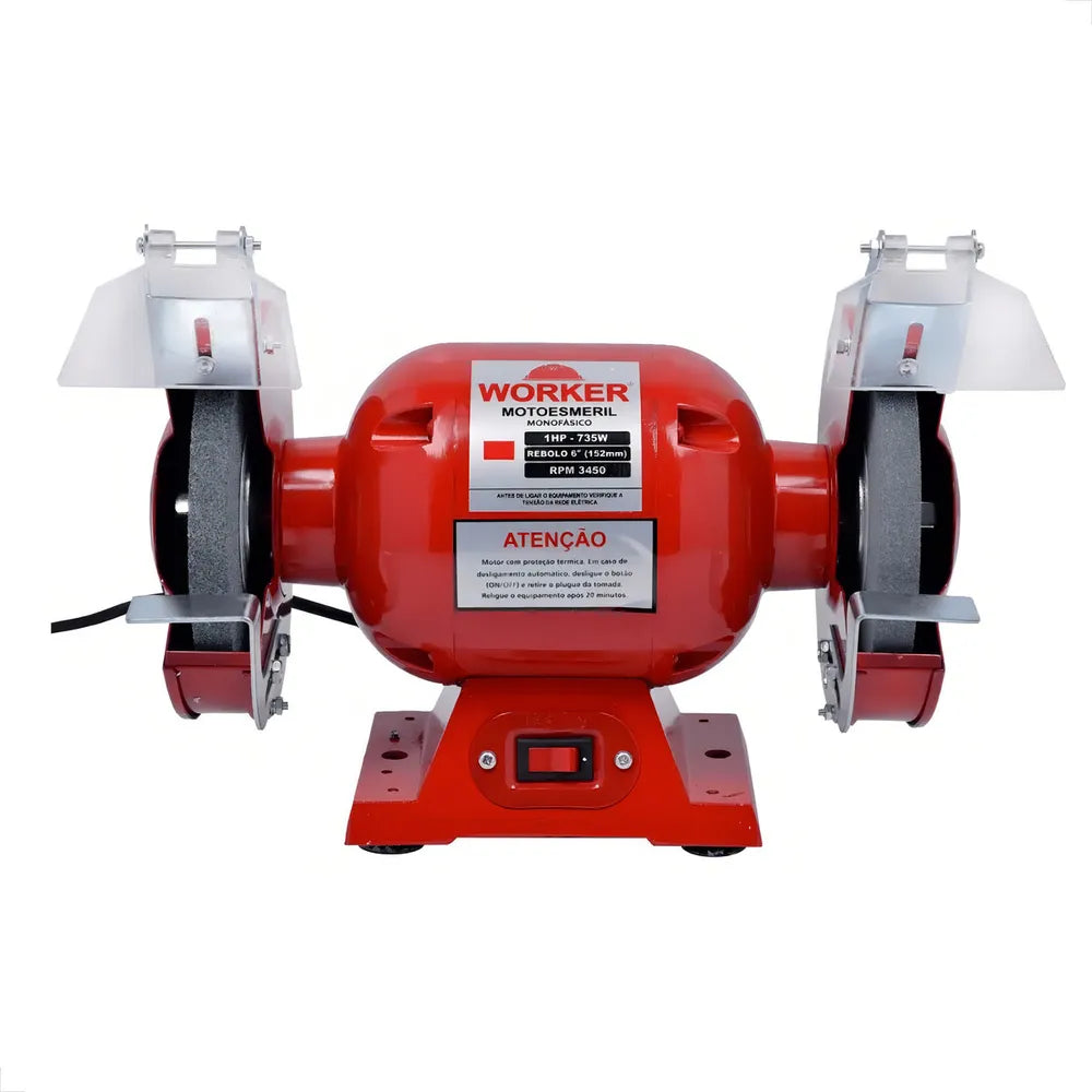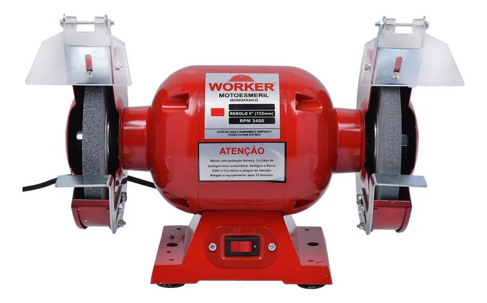 Moto Esmeril Lixadeira De Bancada 735w 1hp Bivolt Worker é ideal para desbastes, afiação e amolação de ferramentas. Possui chave seletora de voltagem 127 ou 220v.