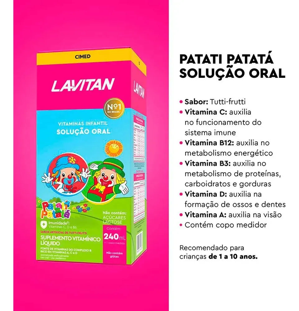 O Lavitan Kids Patati Patatá Suplemento Vitamínico Sabor Tutti-Frutti Líquido 240ml é a maneira prática e deliciosa de garantir as vitaminas essenciais que as crianças precisam para crescer fortes e saudáveis. Enriquecido com vitaminas do complexo B, vitamina A, C e fonte de vitamina D, ele fortalece o sistema imunológico e ajuda na formação dos ossos e dentes, tudo isso sem adição de açúcar.