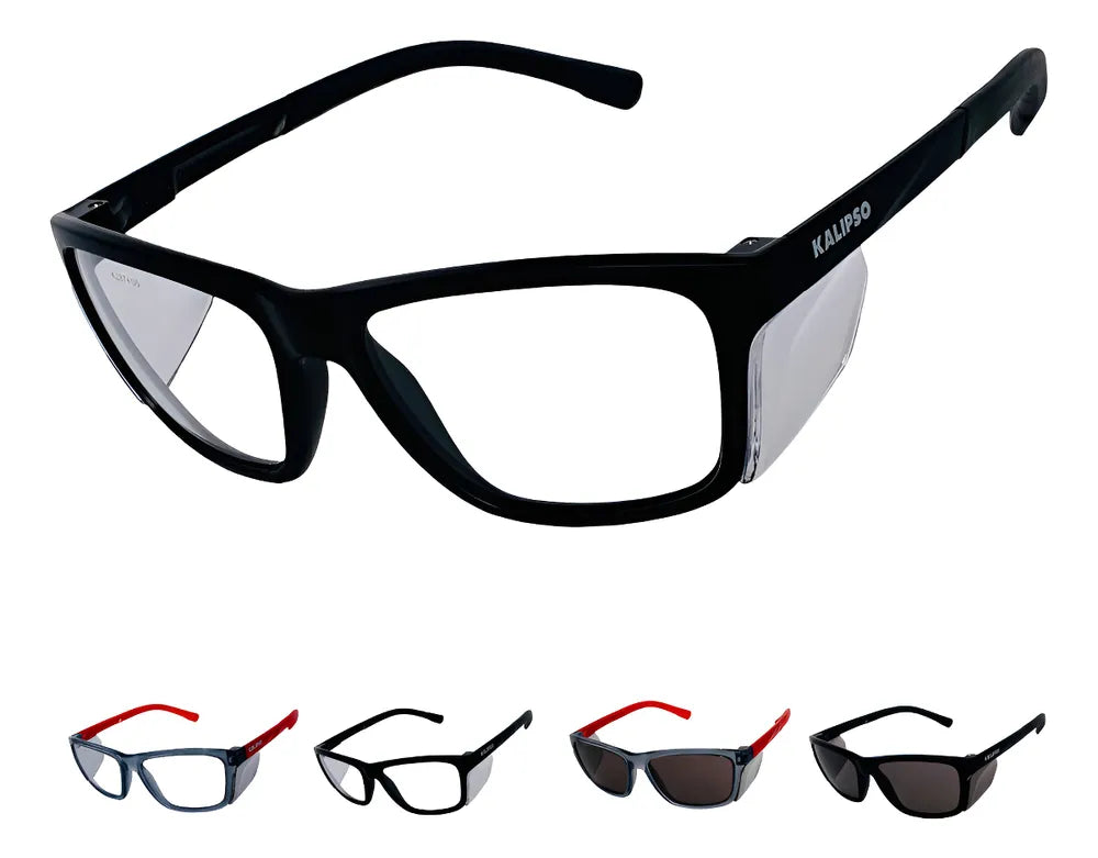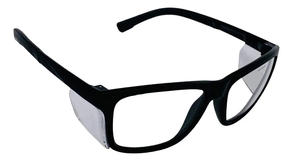 Óculos de Segurança, feitos de um arco de material plástico (nylon), visor fabricado em policarbonato, com proteção lateral acoplada à armação, hastes tipo espátula, feitas do mesmo material da lente, com acabamento emborrachado nas pontas e articuladas na armação por meio de parafusos de aço inoxidável.