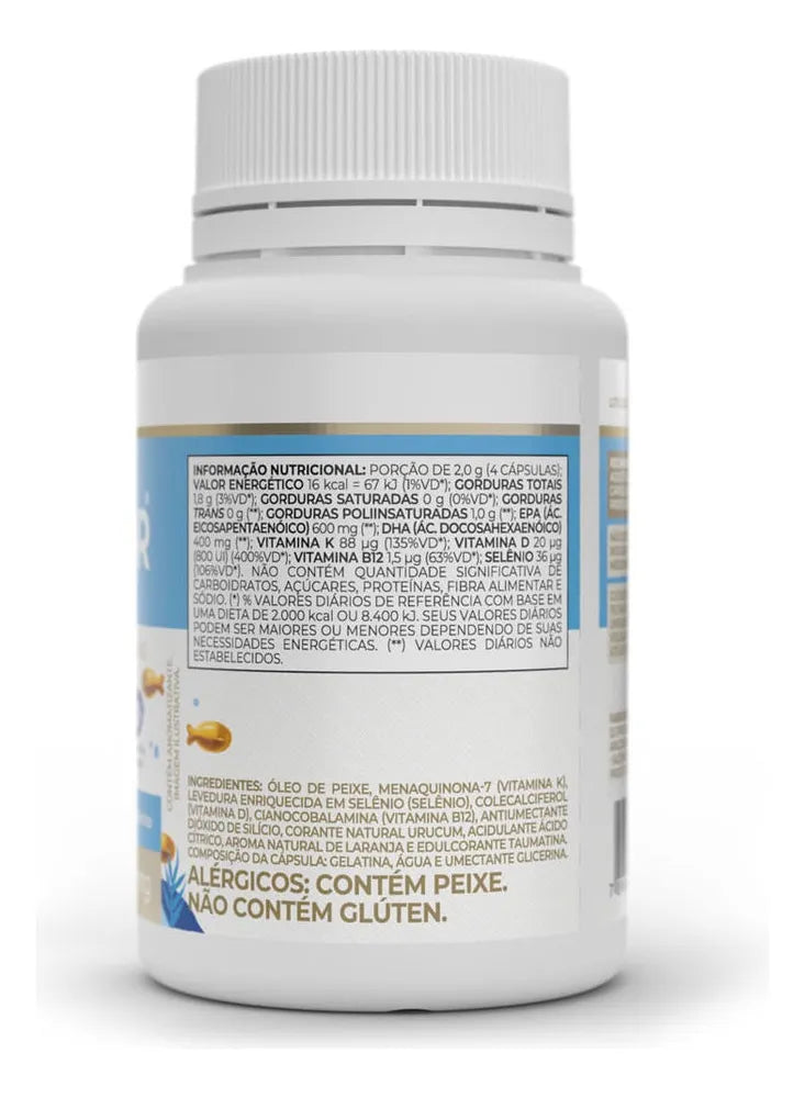 Óleo de peixe, menaquinona-7 (vitamina K), levedura enriquecida em selênio (selênio), colecalciferol (vitamina D), cianocobalamina (vitamina B12), antiumectante dióxido de silício, corante natural urucum, acidulante ácido cítrico, aroma natural de laranja e edulcorante taumatina. Composição da cápsula: gelatina, água e umectante glicerina.