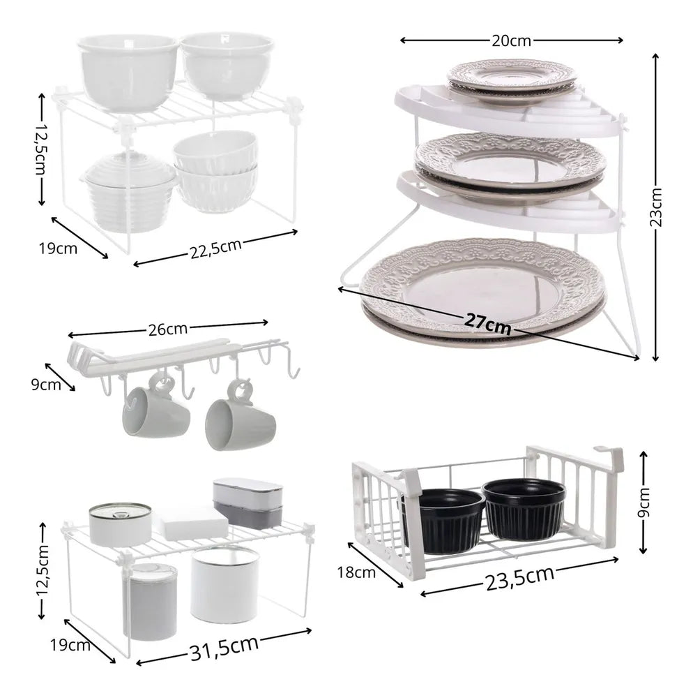 Composição do Kit: 1 Porta Xícaras, 1 Porta Pratos, 1 Prateleira Pequena, 1 Prateleira Média e 1 Cesto de Prateleira Pequeno