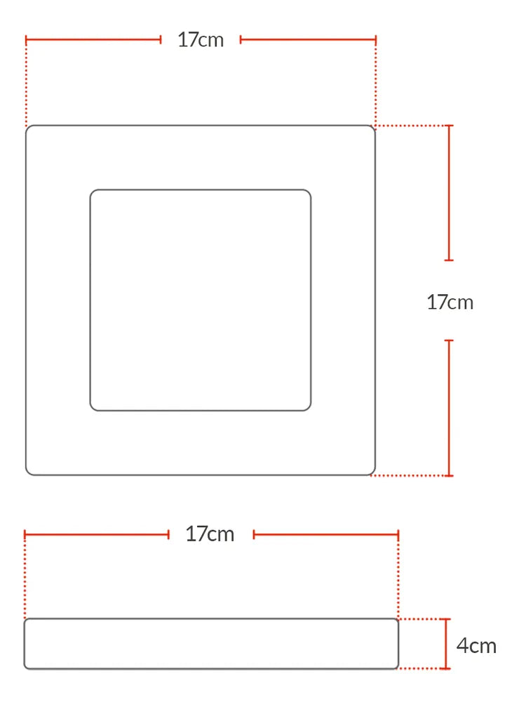 Dimensões: 170mm x 170mm, profundidade: 30mm