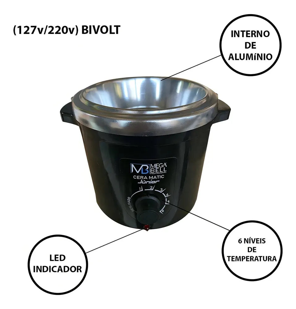 Aquecedor profissional ou doméstico para cera de depilação. Equipado com regulador de temperatura, indicador luminoso de funcionamento e chave seletora de voltagem. Seu corpo plástico e resistência blindada o tornam totalmente seguro.