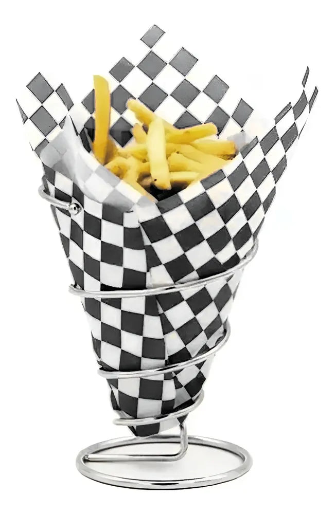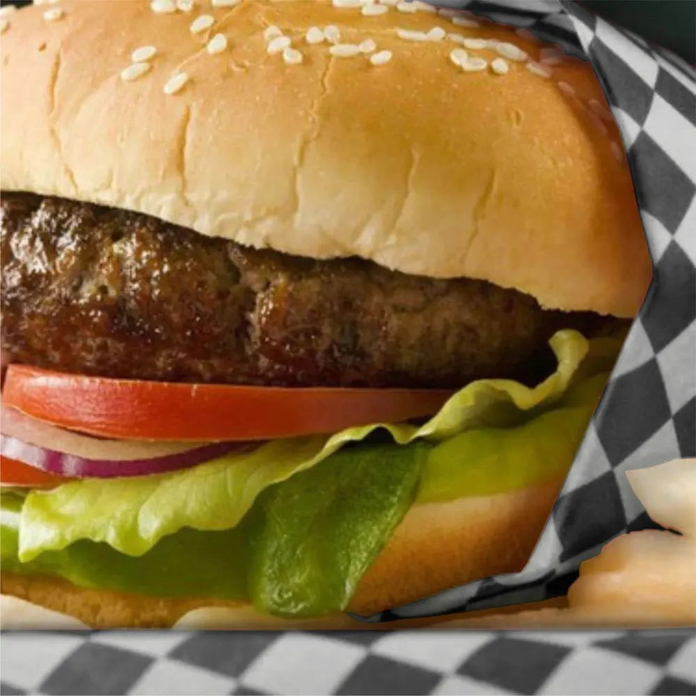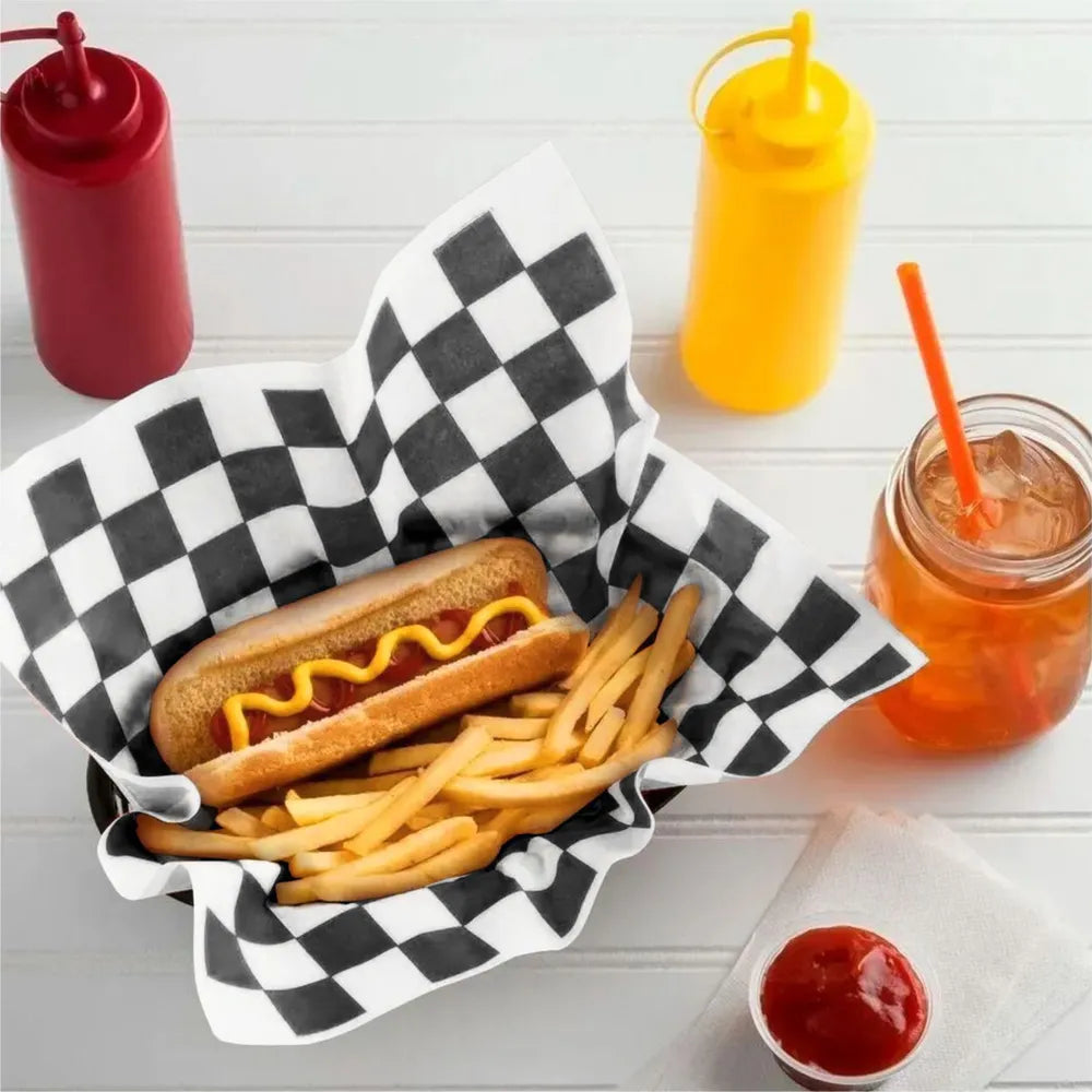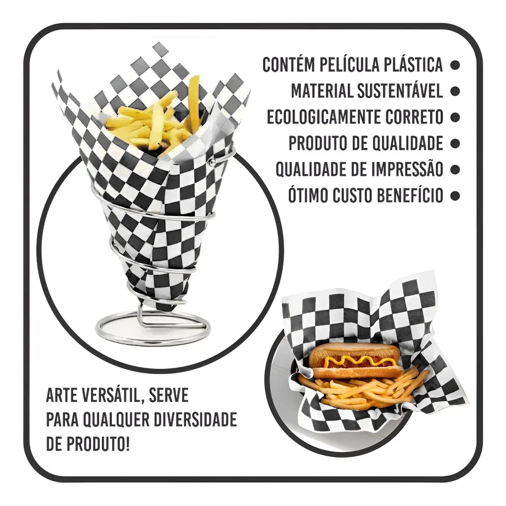 É um material bonito e perfeito para embalar seu alimento, como um lanche comum, hambúrguer, frios, doces, qualquer tipo de alimento, pois com um padrão versátil quadriculado preto, te possibilita a utilizar o material para todos produtos possíveis.