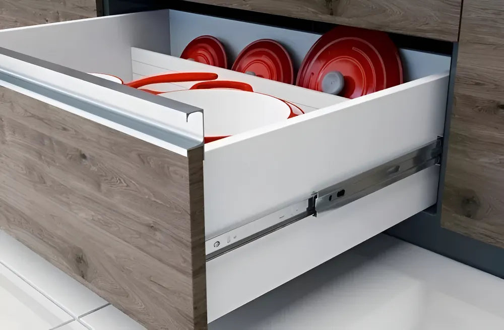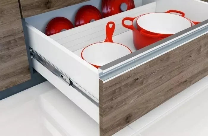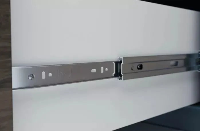 A Corrediça Telescópica Larga Reforçada apresenta abertura / extração total para um melhor aproveitamento e visualização da gaveta e objetos.