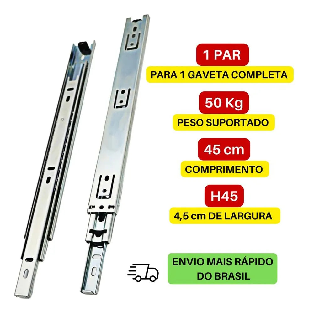1 par de corrediças reforçadas, 45 cm de comprimento, 4,5 cm de largura, para instalação ou substituição completa em 1 gaveta.
