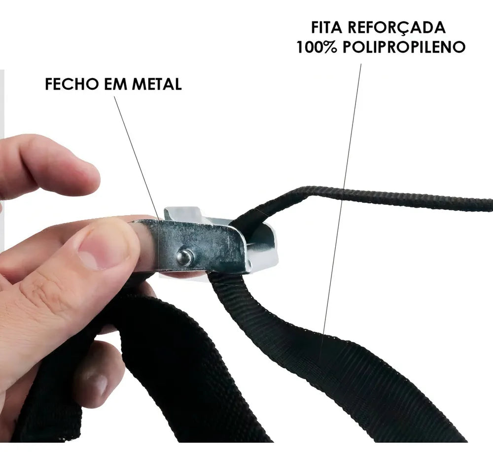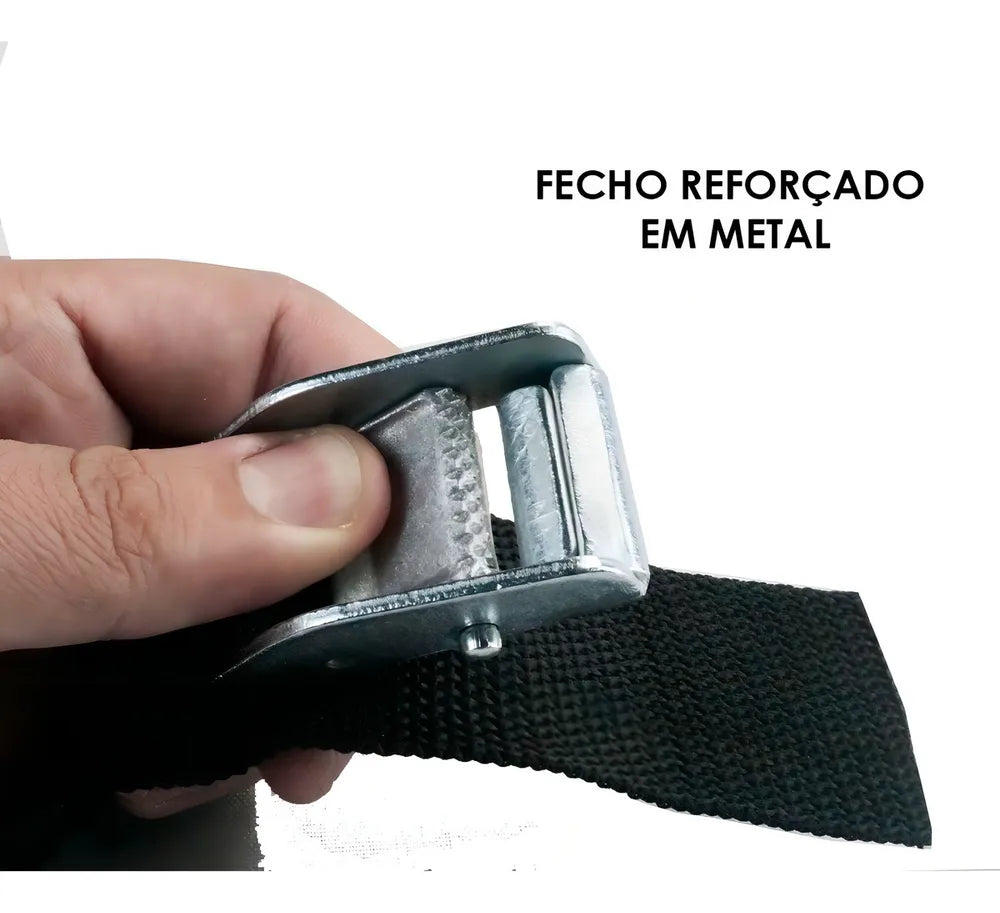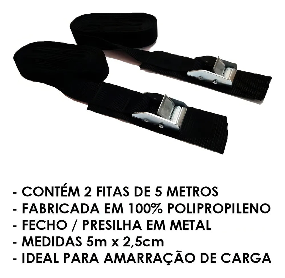 A cinta com proteção para amarração de carga com medida de 5 metros de comprimento e 25mm de largura têm uma ótima resistência pois são confeccionadas em polipropileno e possui uma presilha feita de zamak super resistente a corrosões comparado com latão ou ferro, além de uma proteção extra para evitar riscos com eventual contato da presilha na pintura do veículo. Esta cinta é ideal para quem precisa prender algo com facilidade, o conjunto possui uma resistência suficiente para prender diversos tipos de produtos com segurança como pranchas de surf, bikes, caiaques, cargas, bagagens etc..
