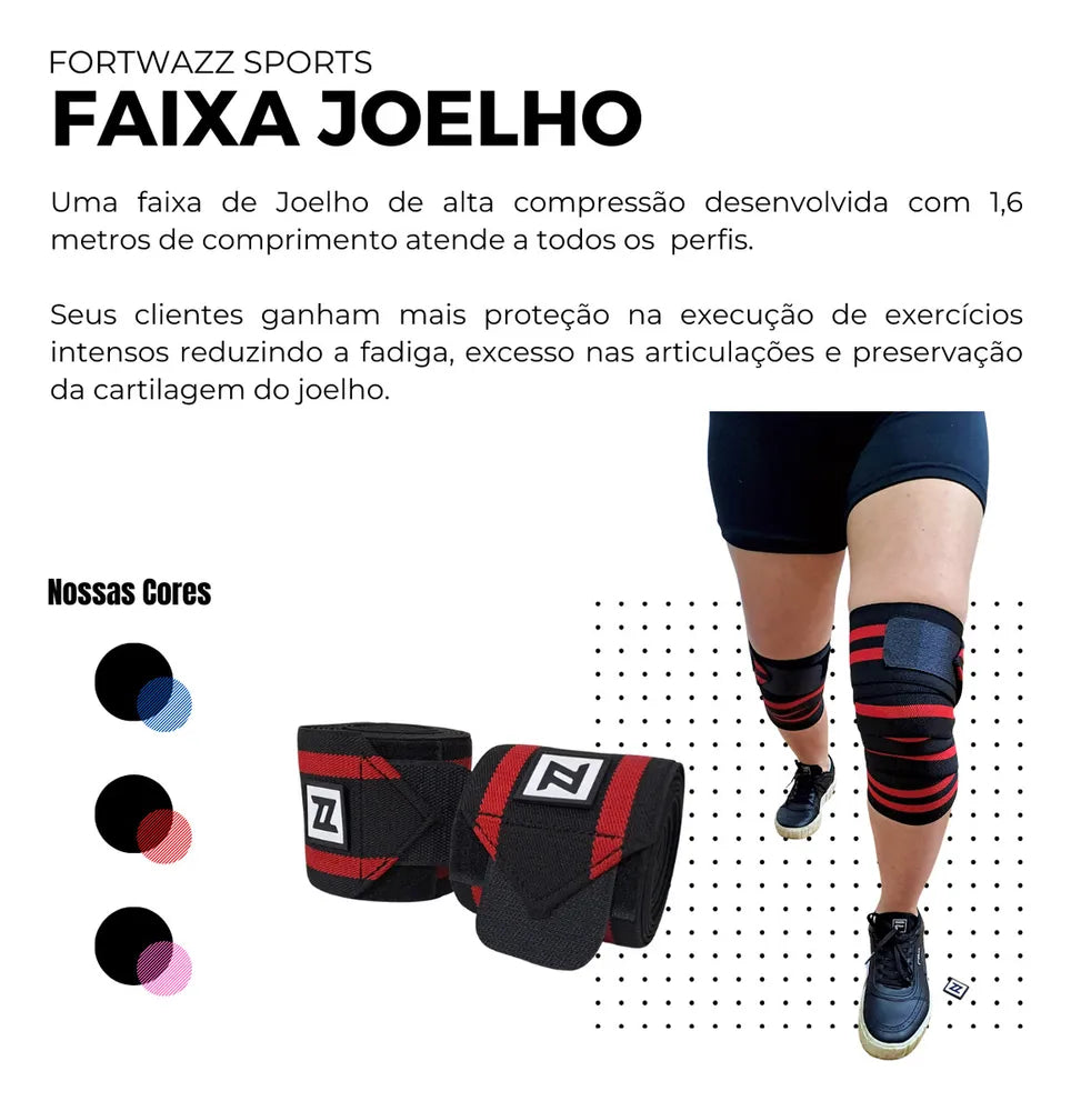 A faixa de joelho de alta compressão da fortwazz foi desenvolvida com 1,6 metros de comprimento para atender a todos os tipos de pernas finas e grossas, te auxilia na execução de exercícios intensos reduzindo a fadiga, excesso nas articulações e preservação da cartilagem do joelho.