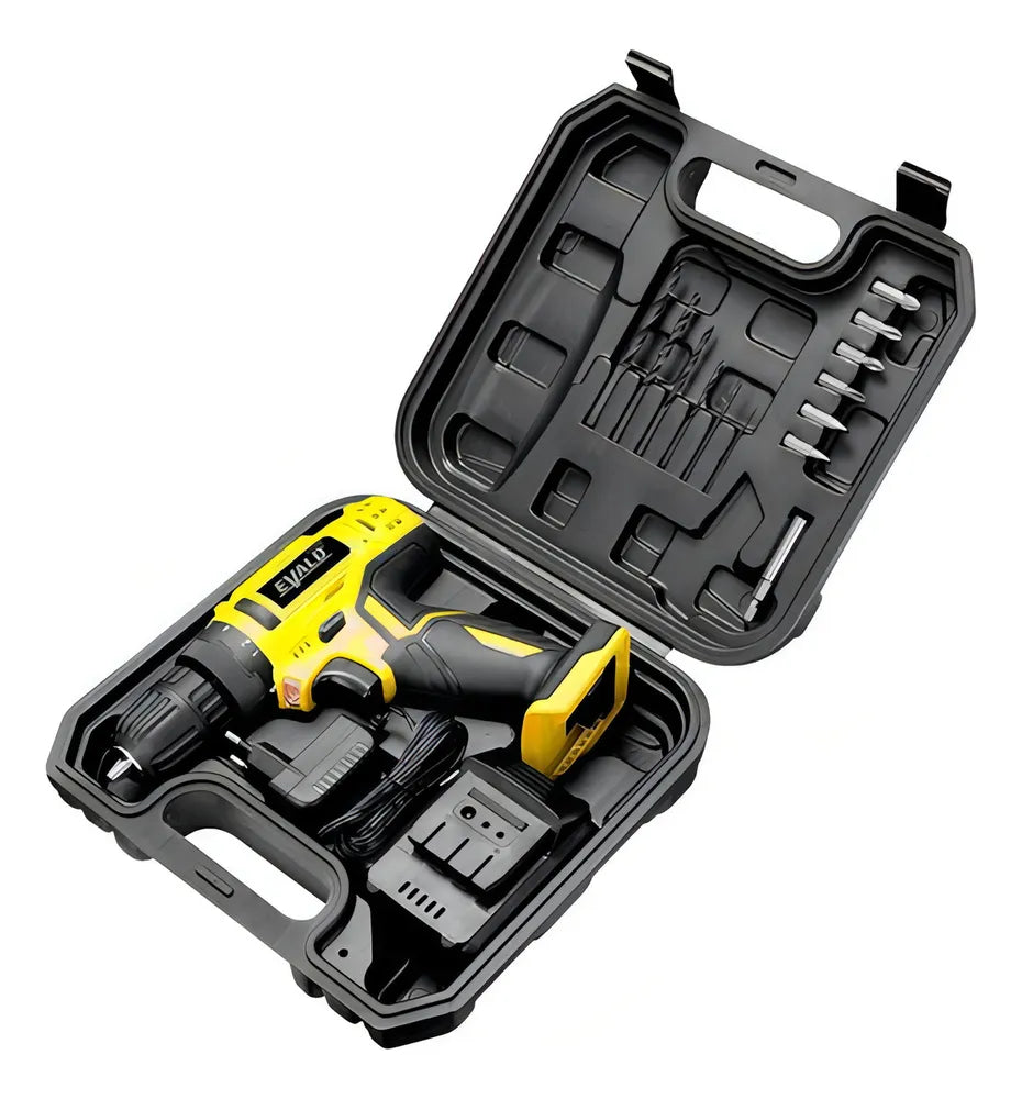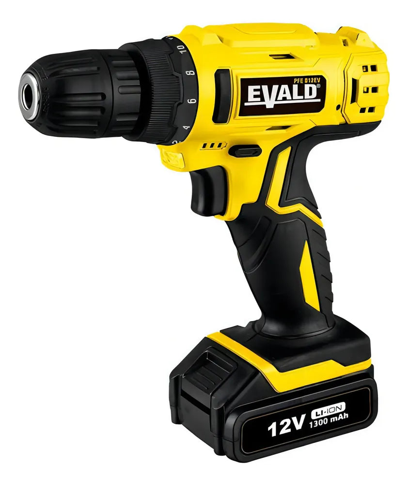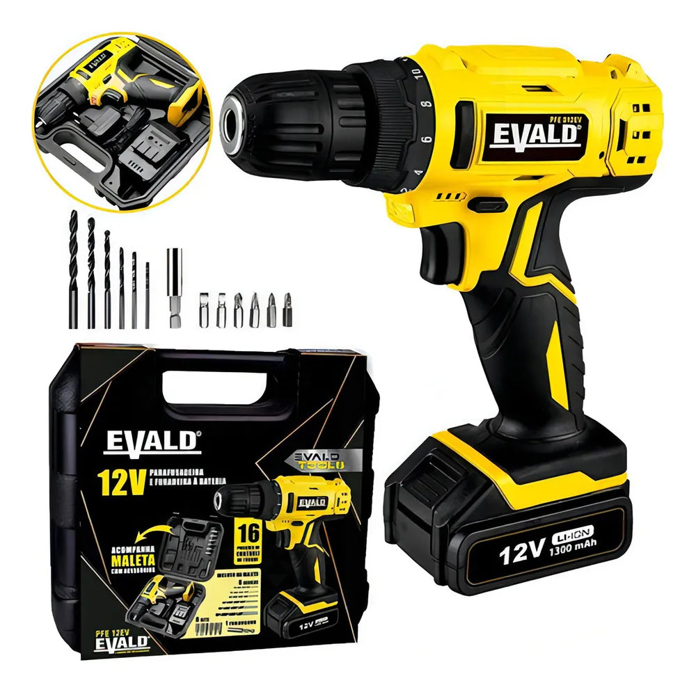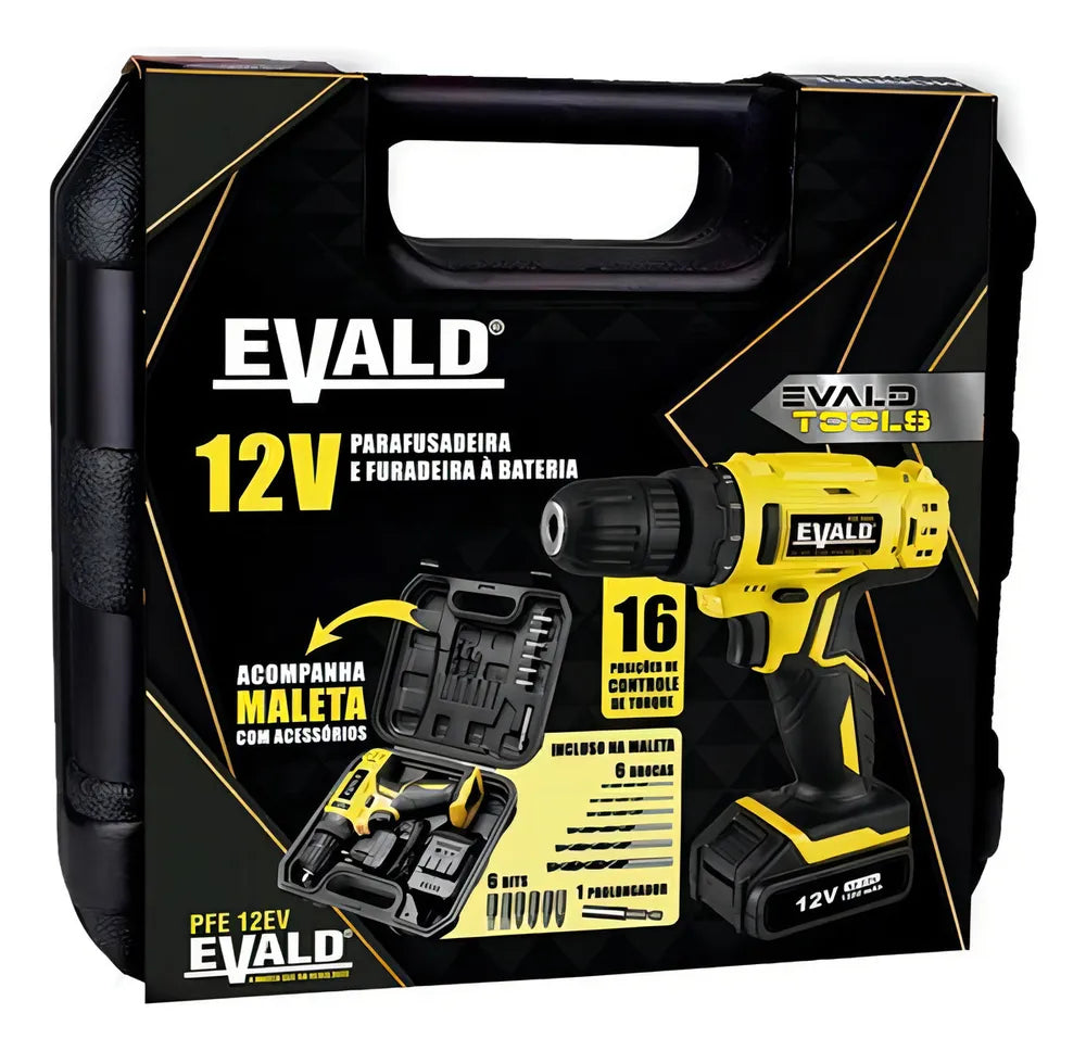 Este produto é uma combinação de Parafusadeira e Furadeira 12V 3/8 POL 10 MM 16 Torques, que vem com uma Maleta e um Kit de 13 Acessórios Bivolt PFE-12EV EVALD.