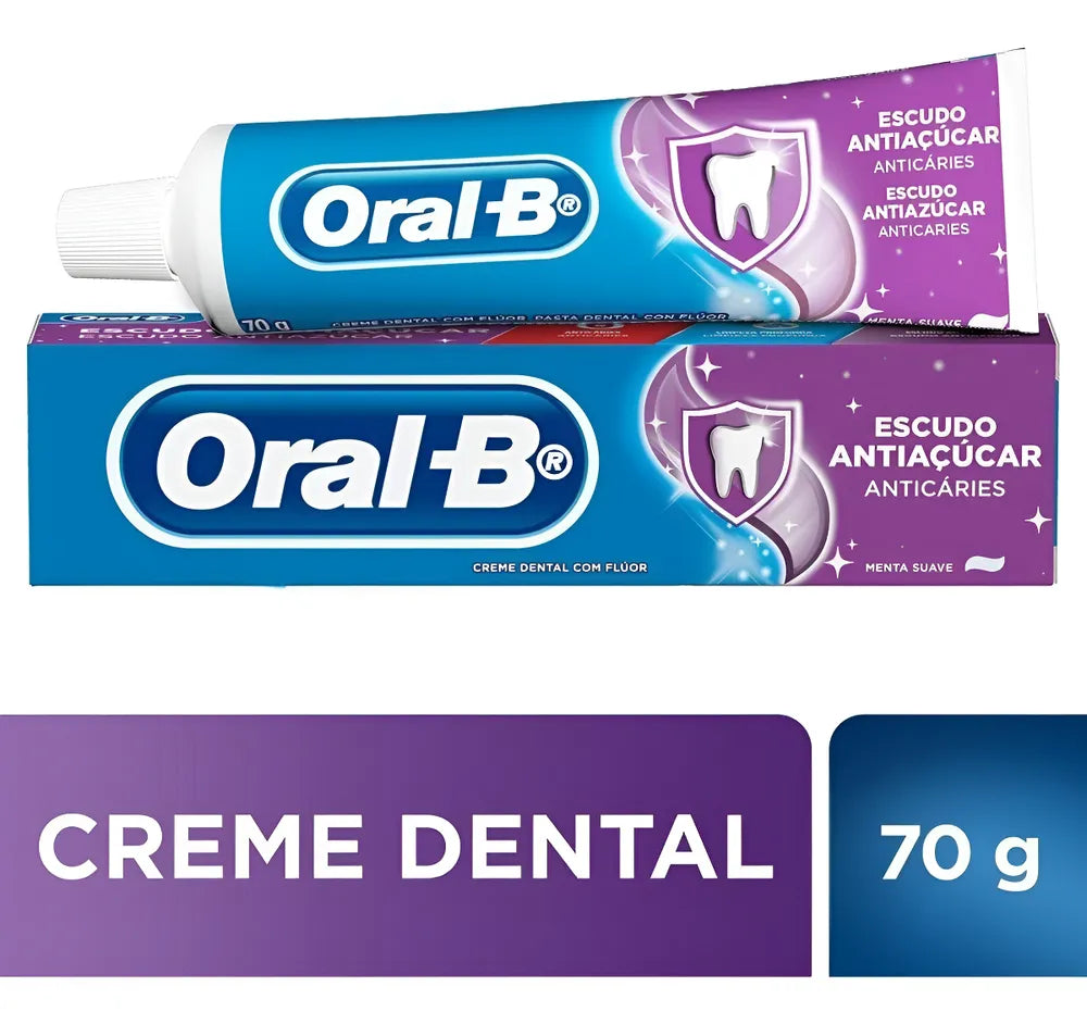 Creme Dental Oral-B Escudo Antiaçúcar: AJUDA A PROTEGER CONTRA ÁCIDOS QUE DANIFICAM OS DENTES. Proteja seus dentes contra ácidos de bactérias que podem danificar o esmalte: O creme Oral-B Escudo Antiaçúcar protege e fortalece os dentes. Sua fórmula contém partículas minerais que são absorvidas pelo dente e formam um escudo contra ácidos das bactérias que danificam os dentes. Oral-B Escudo Antiaçúcar oferece: Proteção anticáries, Limpeza Profunda e Escudo Antiaçúcar.