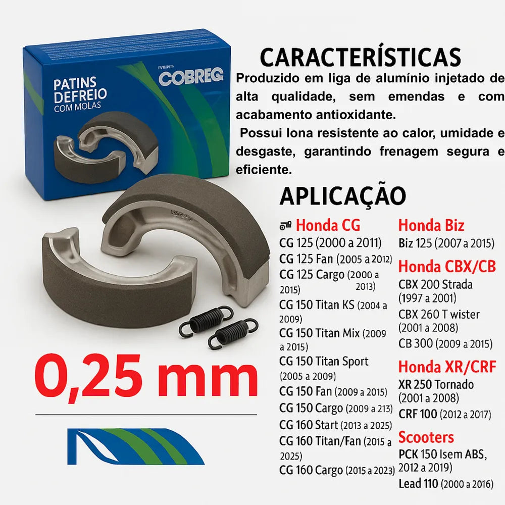 Os patins de freio Cobreq são peças essenciais para o sistema de frenagem de motocicletas, sendo responsáveis por garantir a aderência necessária para a desaceleração segura dos veículos. A Cobreq é uma marca renomada no mercado de componentes automotivos, conhecida pela qualidade e confiabilidade de seus produtos, incluindo os patins de freio, que são projetados para atender a uma variedade de modelos de motocicletas.