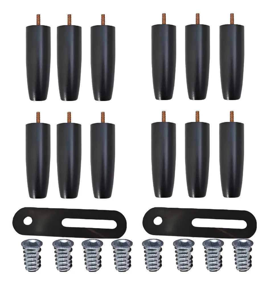 - 12 pés de 12cm de altura em madeira maciça de reflorestamento, cor preta, com ponta de plástico para proteção do piso e redução de ruídos.