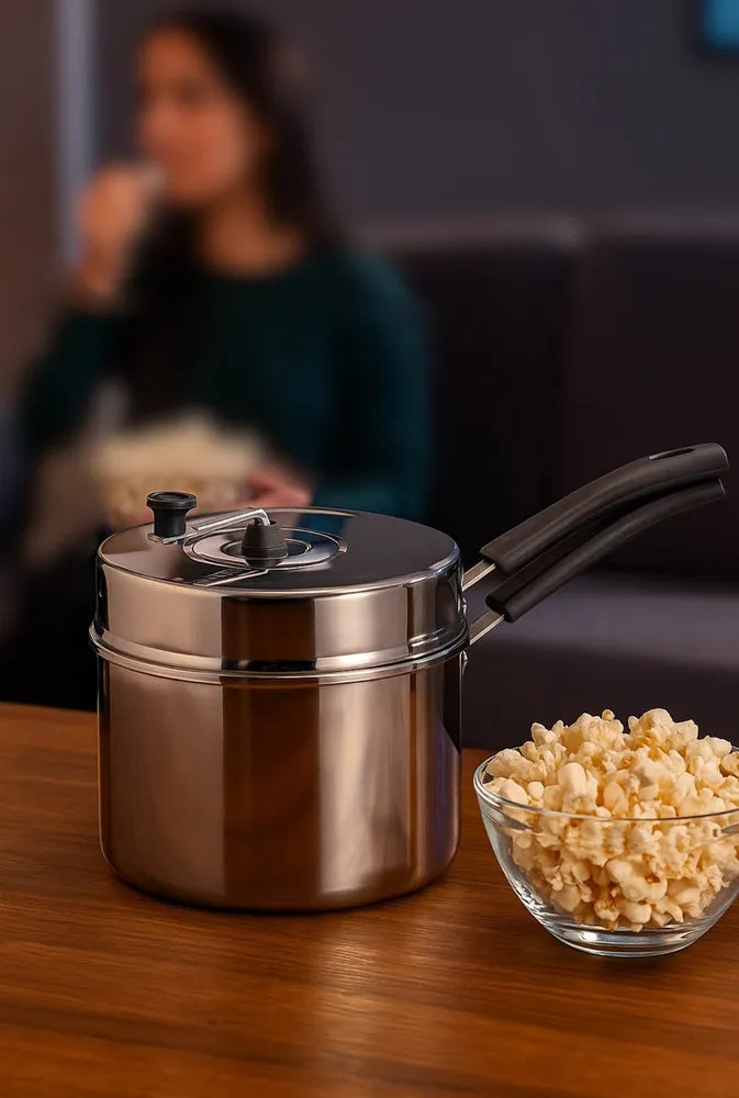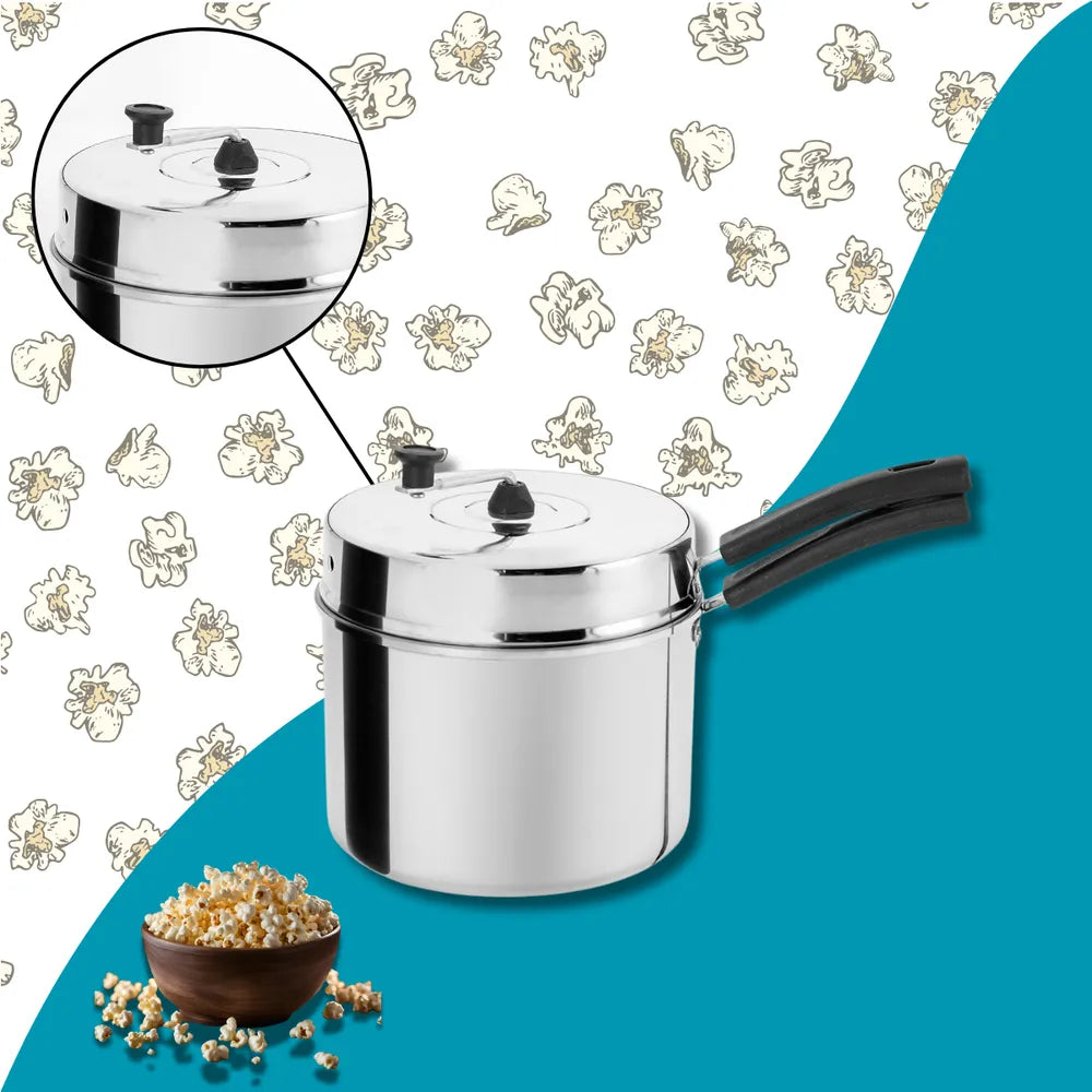 A pipoqueira é feita de alumínio polido, um material resistente e fácil de limpar. O cabo é feito de baquelite, um material que não conduz calor, proporcionando um manuseio seguro durante o uso. A tampa também é feita de alumínio, garantindo uma distribuição uniforme do calor, o que resulta em pipocas perfeitamente estouradas.
