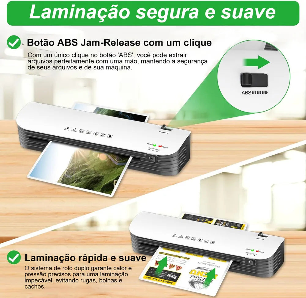 Equipado com um botão ABS que reduz a taxa de atolamento de 3% para 0,1%, resolvendo facilmente os problemas de atolamento. Basta desligar a energia, pressionar o botão liberação de atolamento e retirar o documento com a outra mão, protegendo seus documentos e a plastificadora. Produz um nível de ruído extremamente baixo, proporcionando um ambiente de trabalho tranquilo para você e para os outros. Isso é particularmente vantajoso em ambientes de escritório ou sala de aula, onde um ambiente de trabalho calmo é essencial.