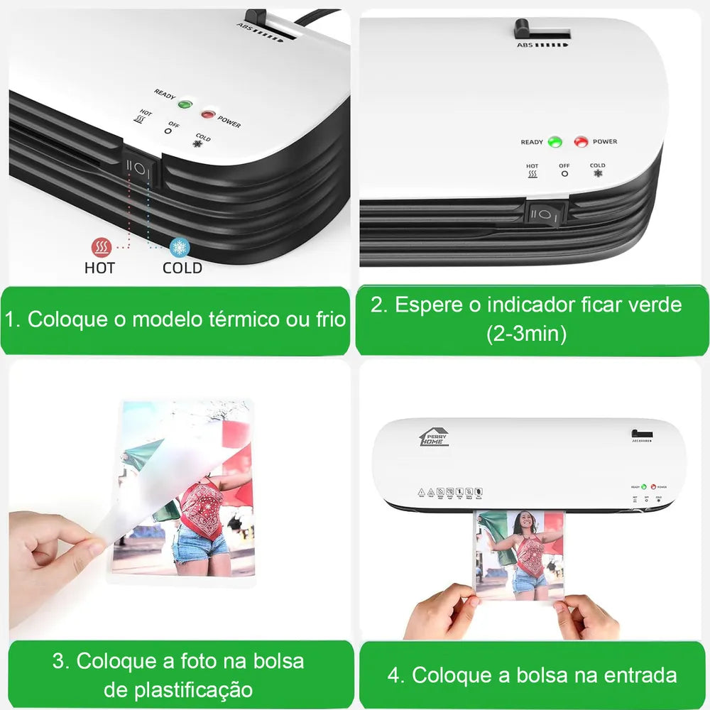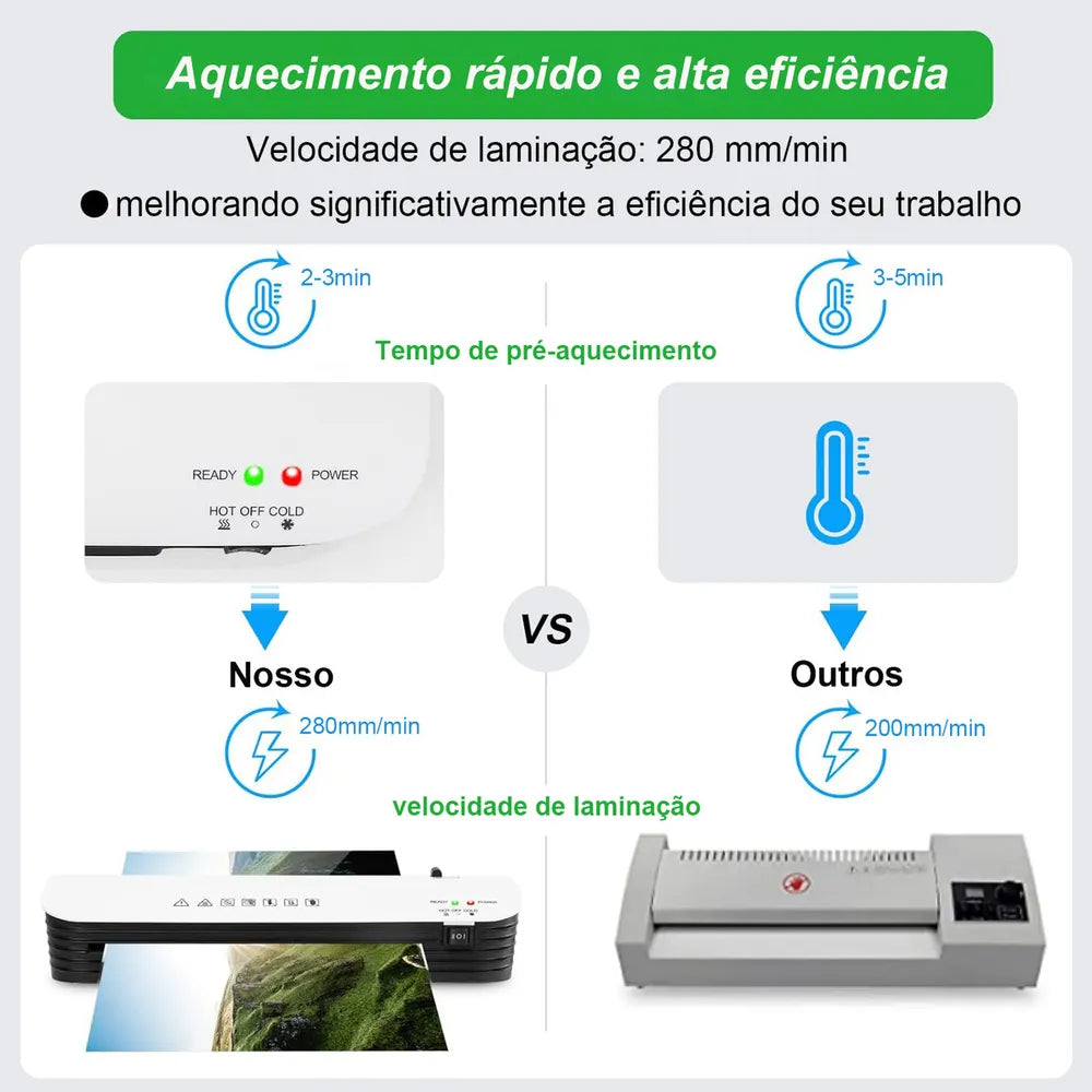 Alta qualidade com sistema duplo de plastificação a quente e a frio, oferecendo uma velocidade rápida de plastificação de 280 mm/min. Ideal para professores, profissionais e usuários domésticos que buscam eficiência e praticidade. O sistema de aquecimento gera calor suficiente para aderir perfeitamente o impresso ao envelope. O sistema a frio não requer pré-aquecimento, basta ligar para plastificar documentos sensíveis ao calor e que podem sofrer danos térmicos (é necessário usar filmes plásticos autoadesivos e com fundo brilhante). Isso torna a plastificadora ideal para ambientes com alta demanda de documentos protegidos, como escolas e escritórios.
