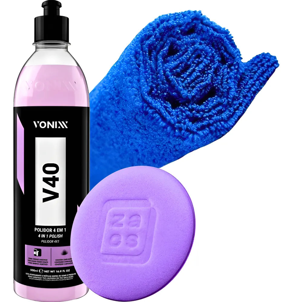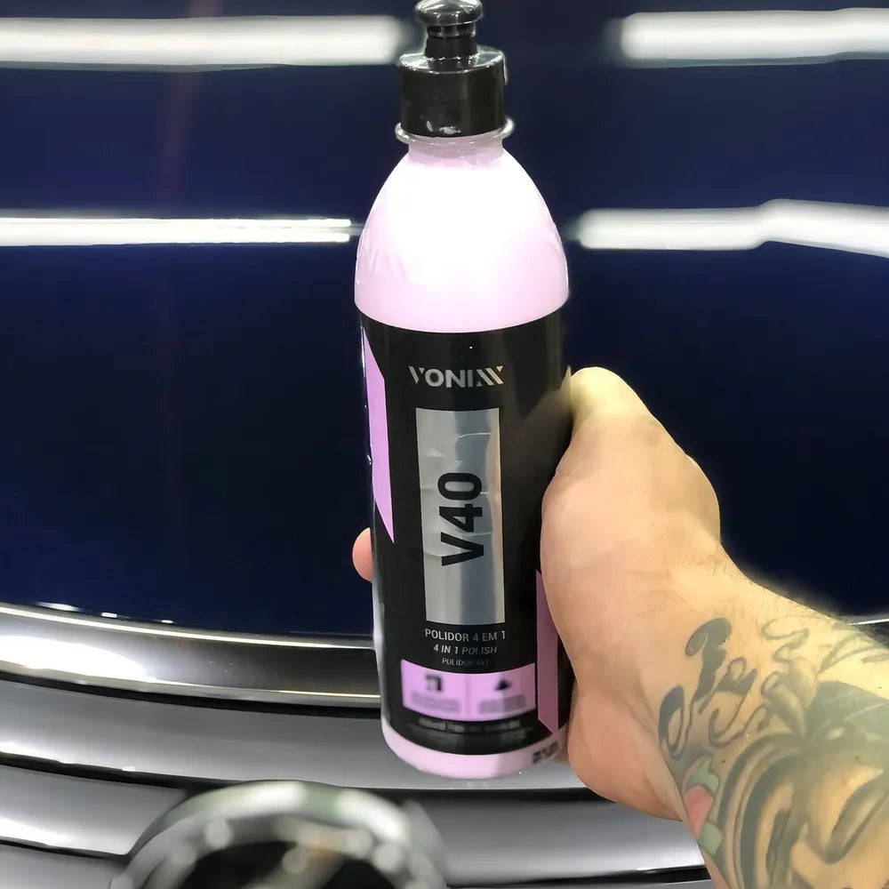 - Devido ao balanceamento perfeito de sua formulação a base de nano abrasivos, cera de carnaúba e solventes especiais, o V40 promove corte, refino, lustro e proteção apenas trocando de boinas.