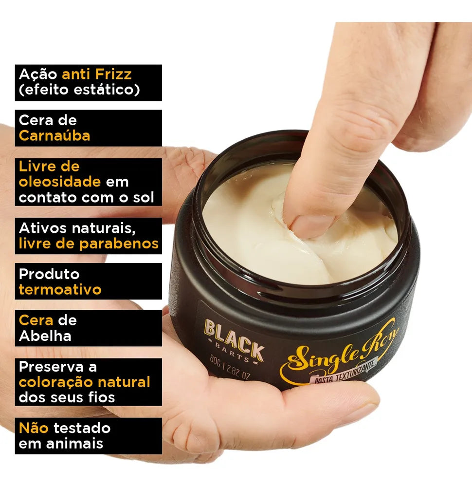 A pomada Matte Effect da Black Barts foi desenvolvida para uso profissional, utilizada por milhares de barbearias pelo Brasil com ação antioxidante e contra efeito estático, protege e fortalece os fios danificados pelos processos químicos e pela radiação UV.