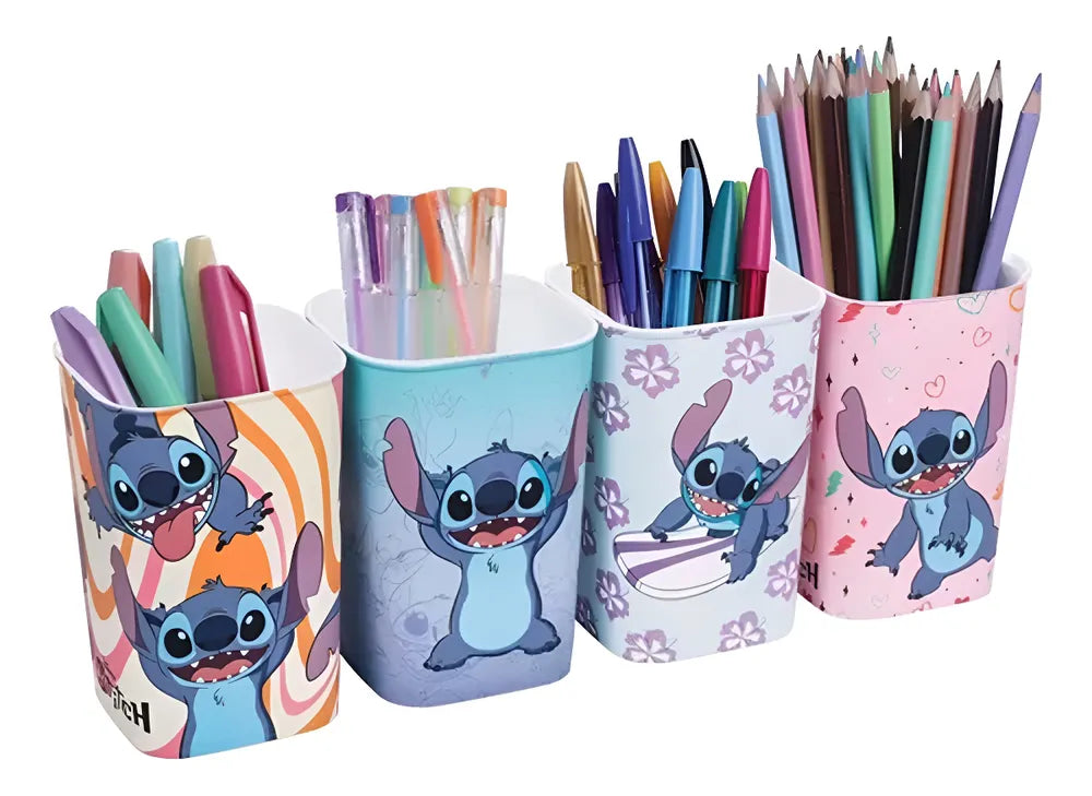 Este pacote inclui 4 porta-canetas infantis com designs Stitch. Os desenhos são mostrados na imagem. Cada porta-canetas mede 11 cm de altura x 8 cm de comprimento x 7 cm de largura. Os produtos possuem o selo de qualidade Plasutil, com mais de 30 anos de experiência. Eles são feitos de polipropileno, um material atóxico e livre de BPA, ou seja, não contêm a substância BPA ou bisfenol A. Eles são produzidos com matéria-prima recuperada e material reciclado. Além disso, oferecem proteção contra os raios ultravioleta.