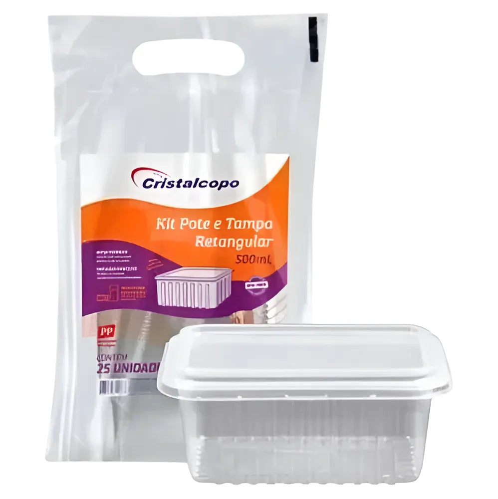O Kit Pote e Tampa Retangular PP 500ML C/25UN - CRISTALCOPO é um conjunto de 25 potes retangulares de plástico com capacidade para 500ml cada, acompanhados de suas respectivas tampas.