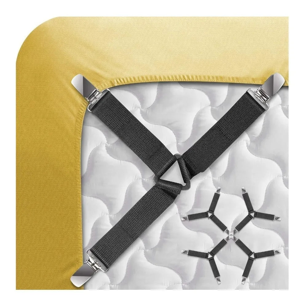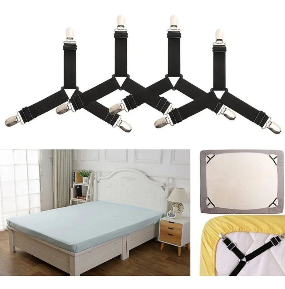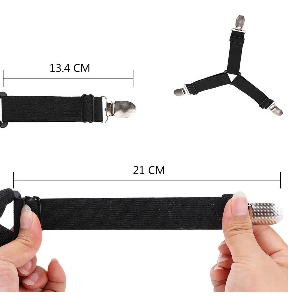 O Prendedor de lençol Elástico ajustável mantém as roupas da cama em seu lugar, segurando firme com 3 pontas a cada canto da cama, garantindo que a cama mantenha-se lisa e firme todos os dias!