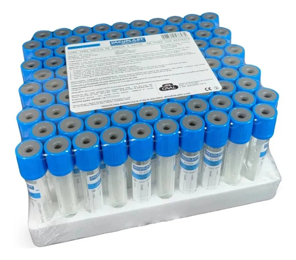 A proveta graduada Vacuplast azul com citrato de sódio de 4 mL foi projetada para a coleta e armazenamento seguro de amostras de sangue em laboratórios clínicos. Sua cor azul facilita a identificação rápida e o material resistente garante durabilidade e alta precisão na medição de líquidos. O citrato de sódio funciona como anticoagulante, permitindo a realização de testes hematológicos confiáveis. A proveta possui marcas claras de graduação para assegurar precisão na medição de quatro mililitros, atendendo aos padrões internacionais de qualidade. É ideal para uso em hospitais, clínicas e laboratórios, sendo compatível com diferentes sistemas de análise. Com seu design ergonômico, a manipulação torna-se fácil e segura, minimizando riscos de contaminação e erros no procedimento. A Vacuplast oferece produtos certificados para máxima segurança e eficácia.
