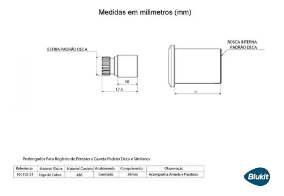 Prolongamento para registros com castelo estria padrão deca e similares 20mm