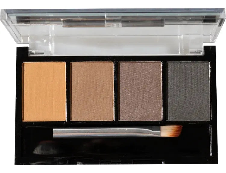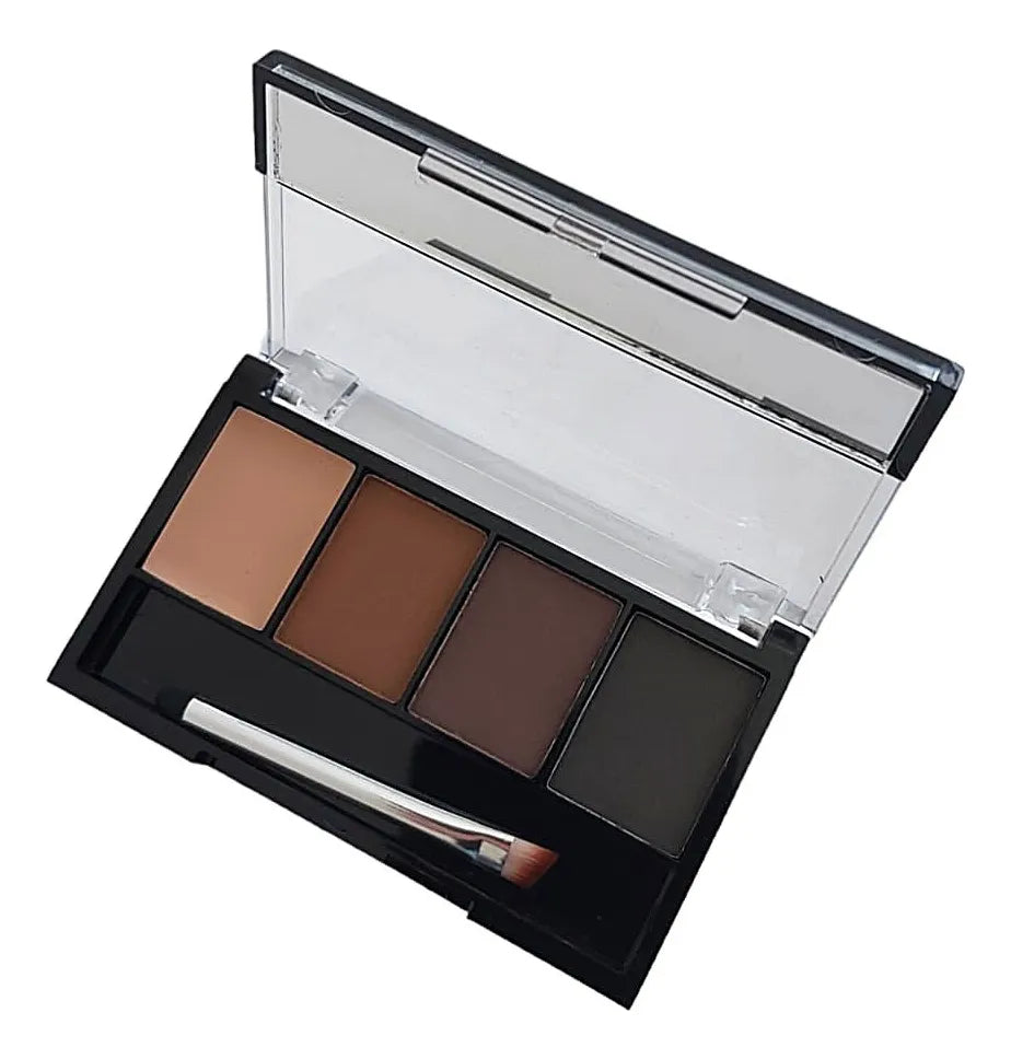 A paleta de sombras para sobrancelha conta com três tonalidades: marrom Claro, marrom médio e preto, incluindo também um primer para auxiliar na fixação da sombra e um pincel com duas extremidades.