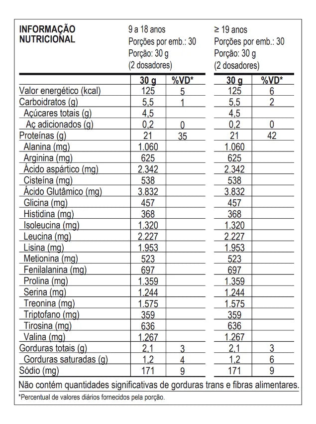 100% Whey fornece 21g de proteína , quantidade de BCAAs podendo variar de acordo com o sabor e 10g de aminoácidos essenciais em 30g de produto.