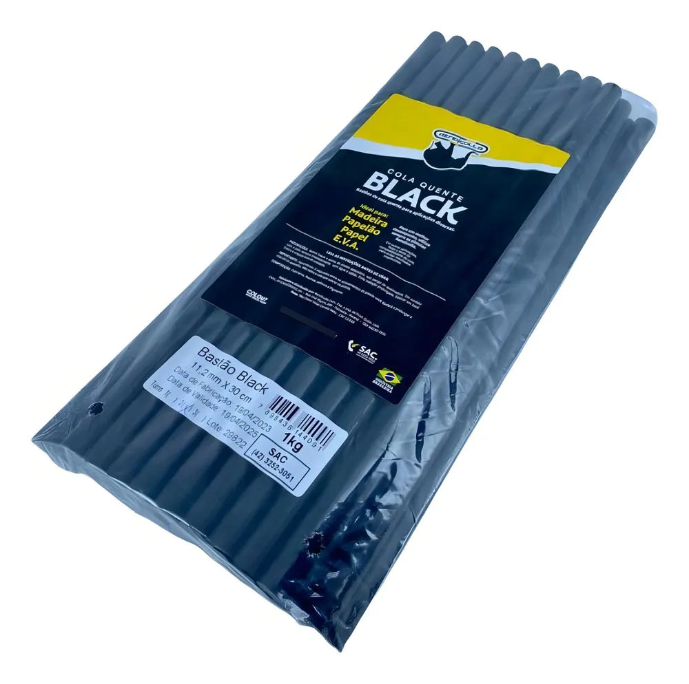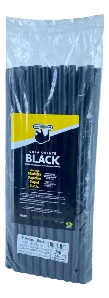 Bastão de cola quente black é um adesivo termoplástico de uso geral. Sua aplicação é para fechamento de caixas, fio de telefone, artesanatos, calçados, martelinho de ouro, etc. Itens inclusos: -01 Refil Bastão de cola quente black 1 Kg. Dados técnicos: -Cor: Preta -Tipo de Cola Quente: Grossa -Odor: Neutro -Diâmetro: 11,2 mm -Comprimento: 300 mm -Ponto de Amolecimento R&B ( º.C ): 87 ~ 93 (º.C) -Validade: 2 Anos Composição: -EVA -Resina Vegetal -Taquificante a Base de Petróleo e Pigmentos É importante observar a temperatura de aplicação, pois se aplicar e temperatura baixa, poderá comprometer a aderência, também é recomendado estocar em locais arejados e livres do sol com temperatura entre 10°c e 30°c. - Imagens ilustrativas'.