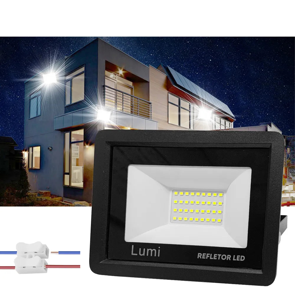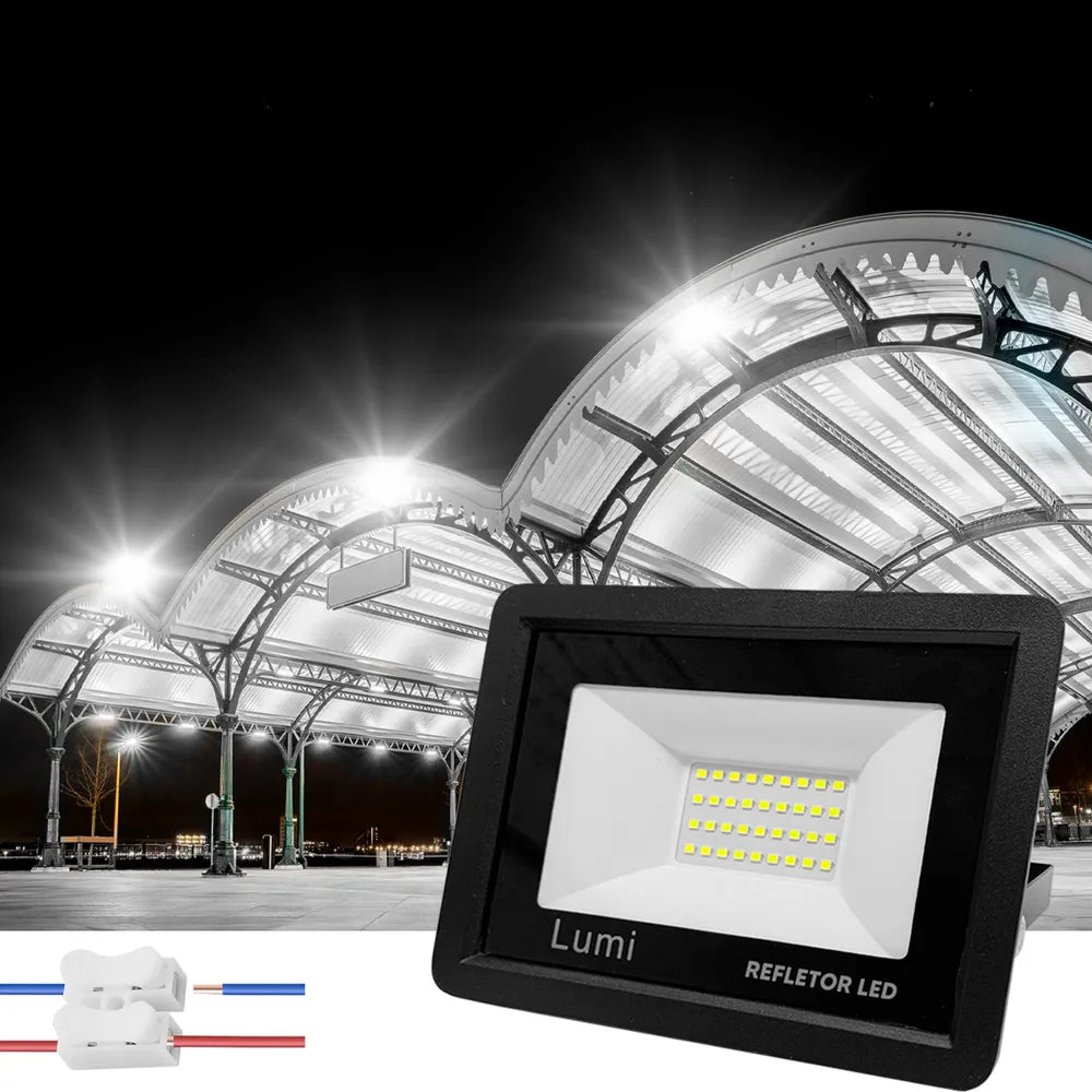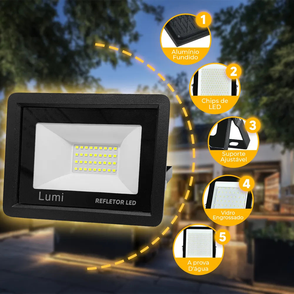 Refletor super LED 100W holofote bivolt 110V/220V prova d'água branco frio Lumi premium. Este refletor SMD se difere dos outros modelos comuns justamente por conta de que seus leds são soldados individualmente na mesma placa, tornando a iluminação mais espalhada e uniforme Sua instalação é feita por meio da fixação da haste que acompanha o refletor Ideal para iluminações externas, sendo, residenciais, empresariais, comerciais na parede, chão ou teto ,canteiro de obras, armazéns e jardins