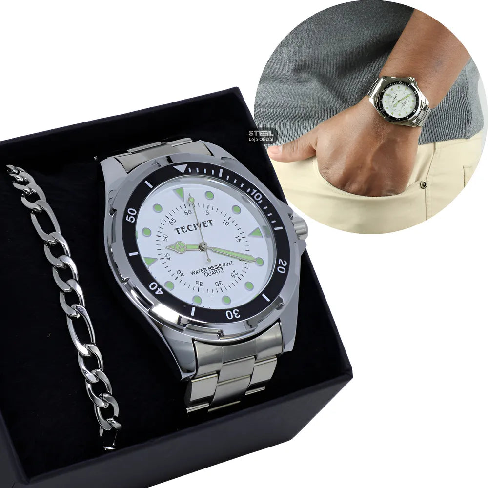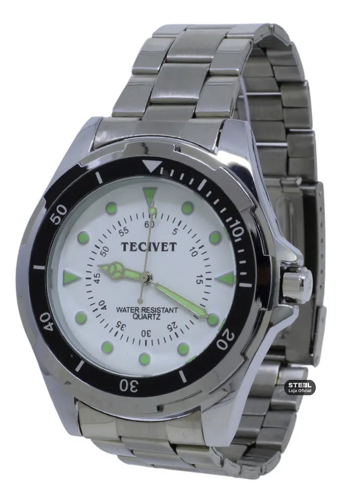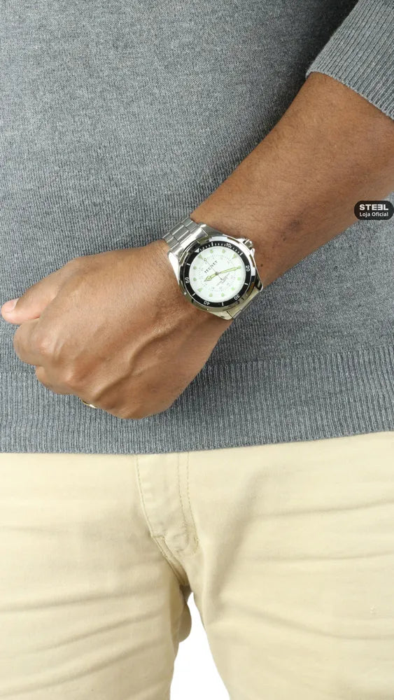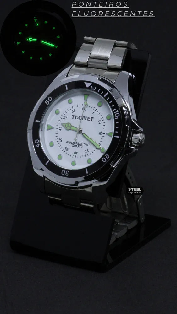 Relógio Clássico Masculino, o clássico que nunca sai de moda. Modelo com Pulseira de Aço Inox e resistente a agua. Mostrador de tamanho médio e Ponteiros Fluorescentes (Brilham no escuro!)