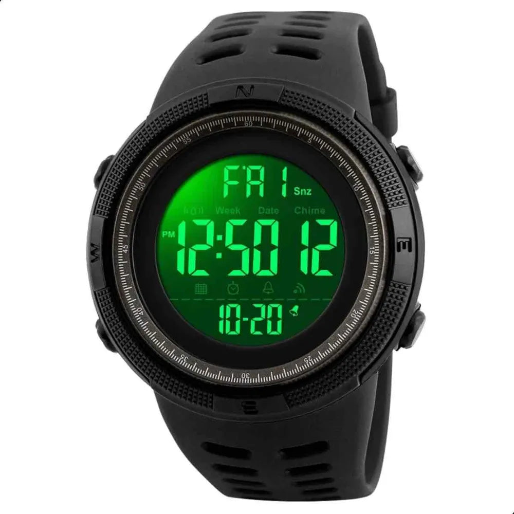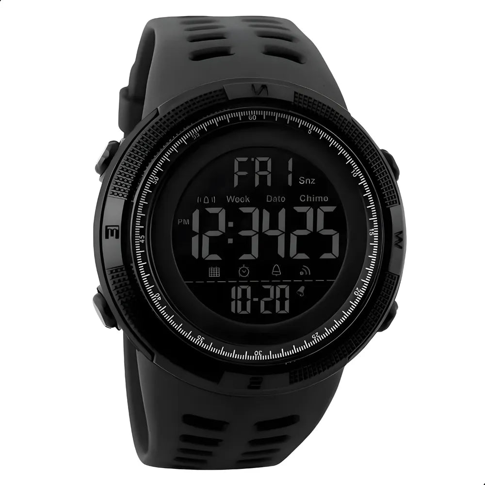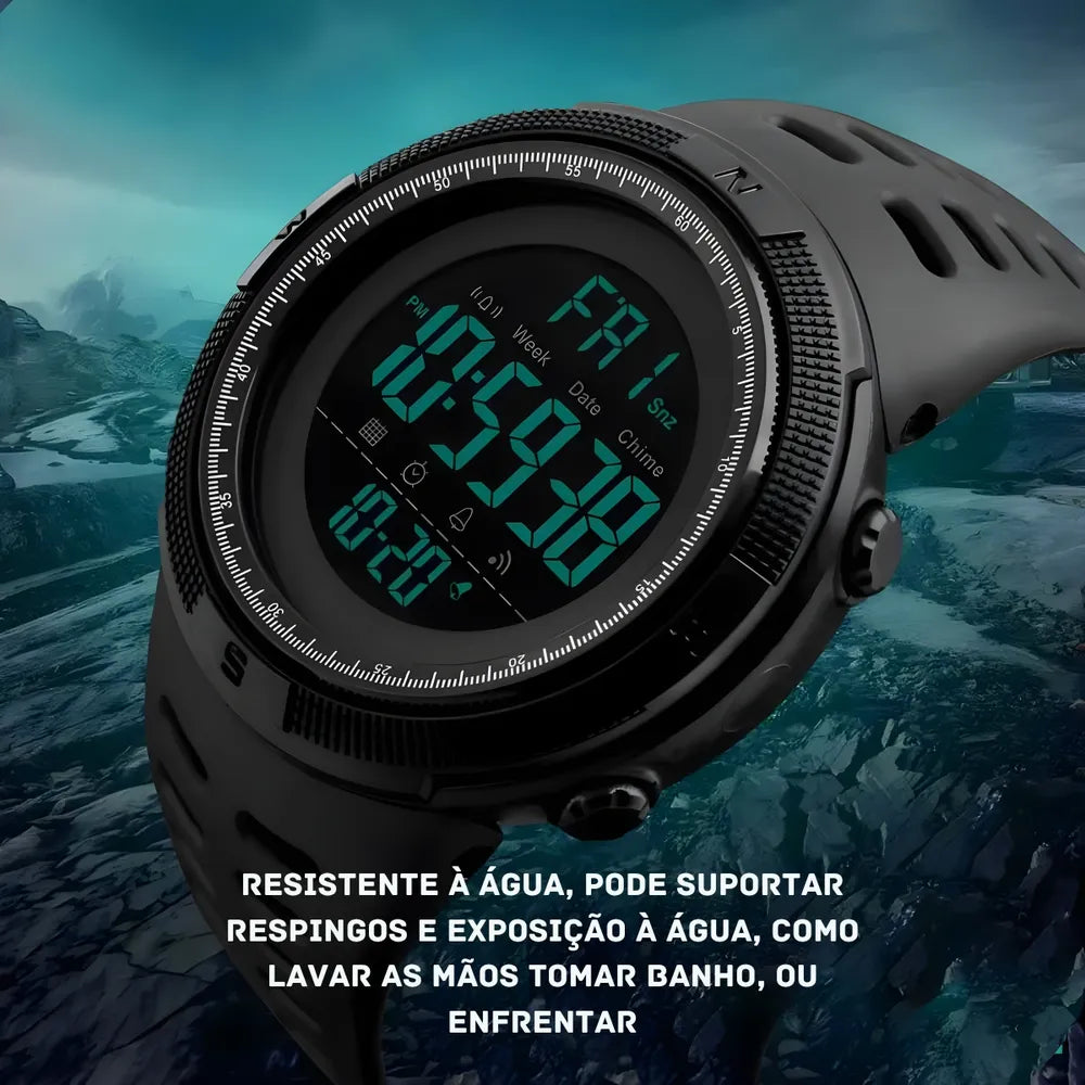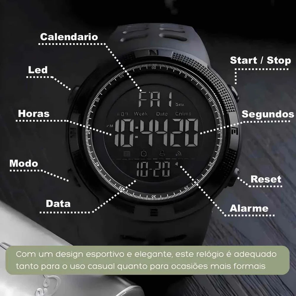 Relógio masculino digital esportivo à prova d'água é um acessório versátil e funcional projetado para atender às necessidades dos homens ativos e esportistas que desejam manter o controle do tempo e de várias funções, mesmo em ambientes úmidos ou aquáticos. Aqui está uma descrição detalhada de suas principais características: