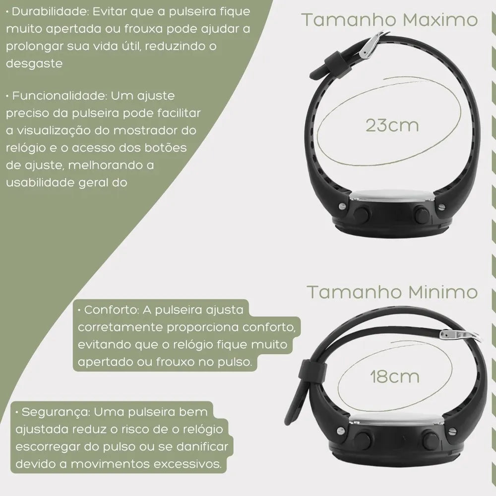 Pulseira Durável: A pulseira é feita de borracha, silicone projetada para resistir ao desgaste e ao contato com a água.