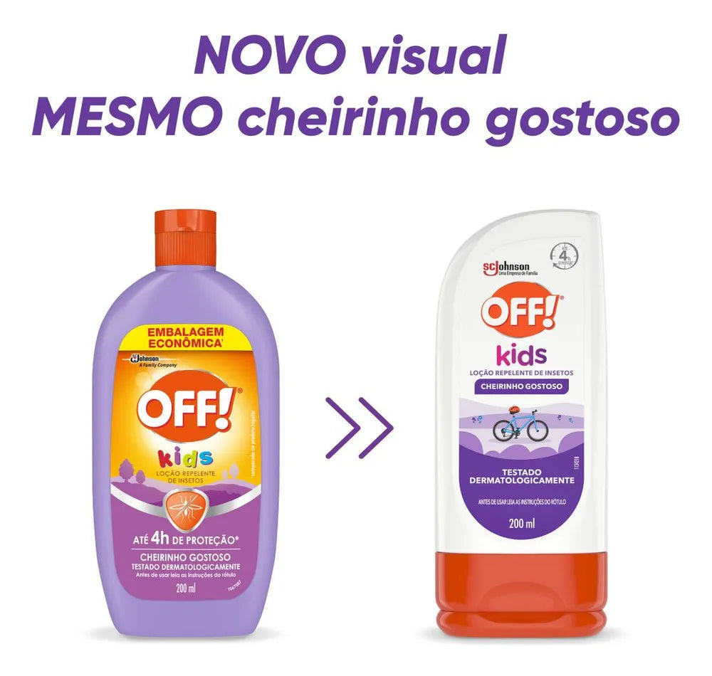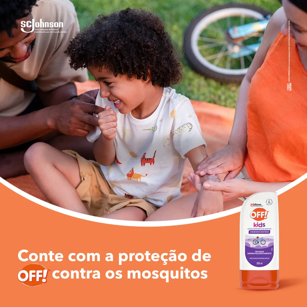 OFF! Kids é a escolha certa para os pequenos e foi cuidadosamente desenvolvido para proteger a pele delicada das crianças contra picadas de mosquitos. Indicado como repelente infantil, sua fórmula exclusiva, além de não ser oleosa, possui um cheirinho gostoso e pode ser usado em crianças maiores de 2 anos.
