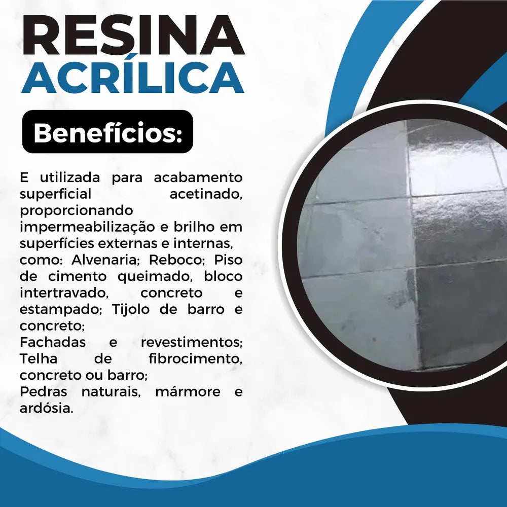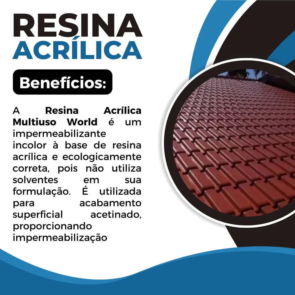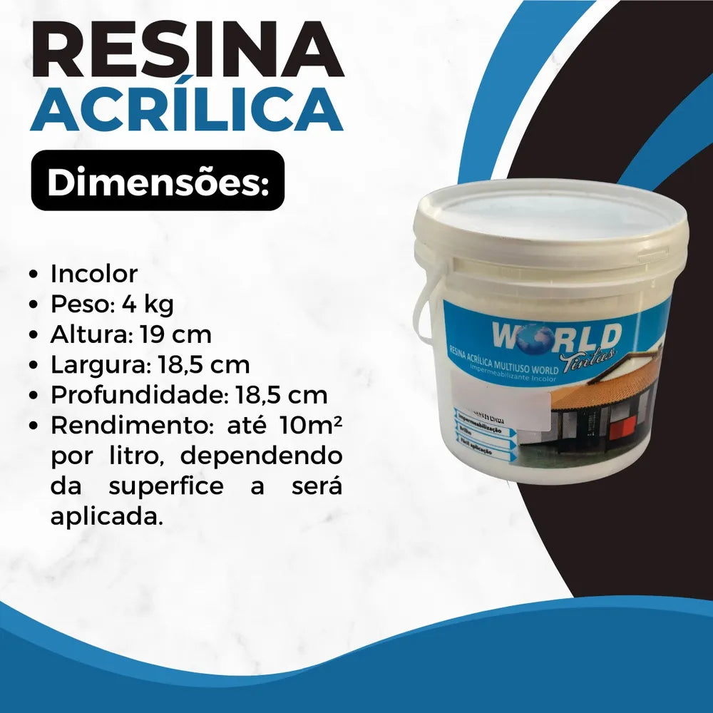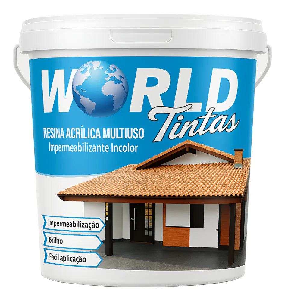 A Resina Acrílica Multiuso World é um impermeabilizante incolor à base de resina acrílica, ecologicamente correta, pois não utiliza solventes em sua formulação. O produto é disperso em água, de fácil aplicação e evita incrustações de sujeiras, fungos e bactérias, proporcionando um aspecto mais limpo ao ambiente.