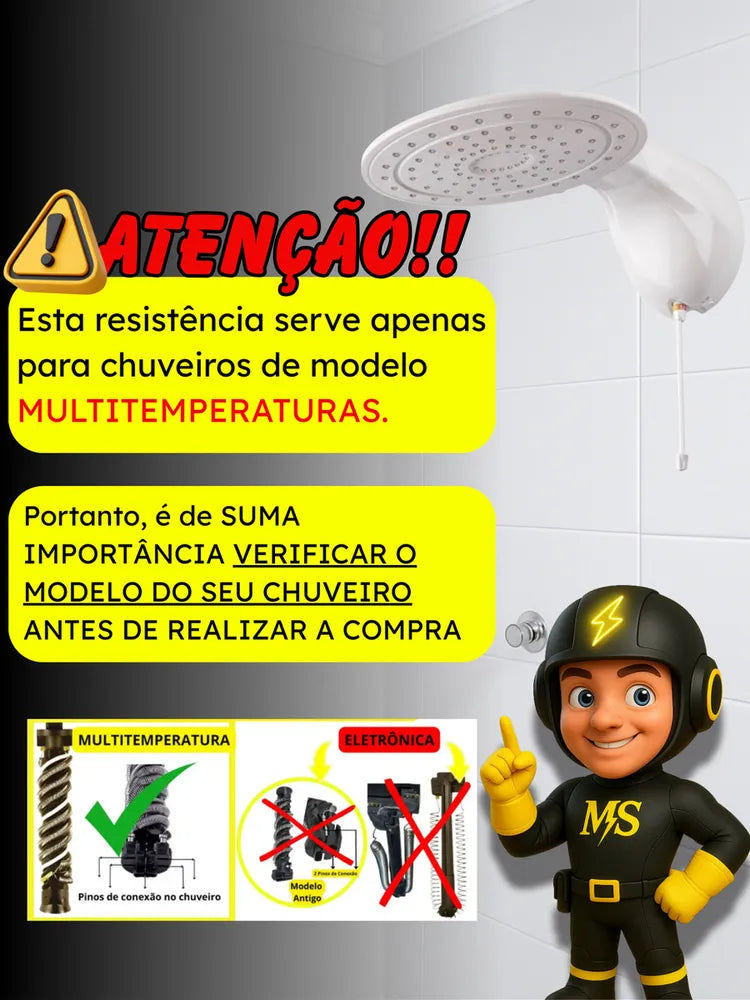 Para um bom banho sempre quente, a resistência é uma das partes mais importantes, pois é passando por ela que a água aquece. Como existem diversos tipos de duchas, cada uma com sua particularidade, deve-se considerar qual o modelo, marca da ducha, qual sua voltagem (volts) e qual sua potência (watts). Além disso, ela possui um sistema troca fácil e já vem montada.