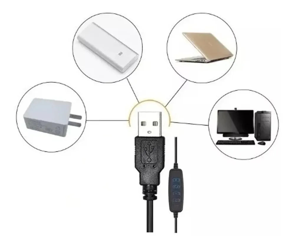 Cabo com controle de liga/desliga, tipo de cor e intensidade de luz.