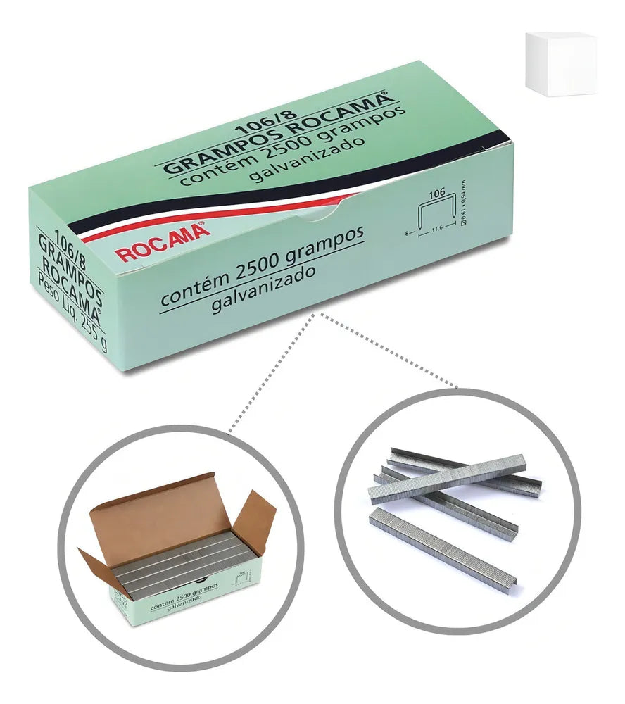 O Kit Rocama - 2 Caixas com 2500 Grampos 106/8 é a solução ideal para suas necessidades de grampeado. Cada grampo, com largura de 11,6 mm e altura de 8 mm, é fabricado em aço galvanizado, garantindo durabilidade e resistência. Este kit é compatível com diversos grampeadores manuais, incluindo os modelos Rocama 106 Premium, Rocama 106/R, Rocama 51/A e Rocama Slim, tornando-o versátil para diferentes aplicações. Perfeito para projetos de artesanato, decoração e tapeçaria, este produto é essencial para quem busca qualidade e eficiência. Com 2500 unidades por embalagem, você terá grampos suficientes para realizar suas tarefas sem interrupções. Além disso, o item é novo e não possui validade, assegurando que você possa utilizá-lo sempre que necessário. Invista em qualidade e praticidade com o Kit Rocama!