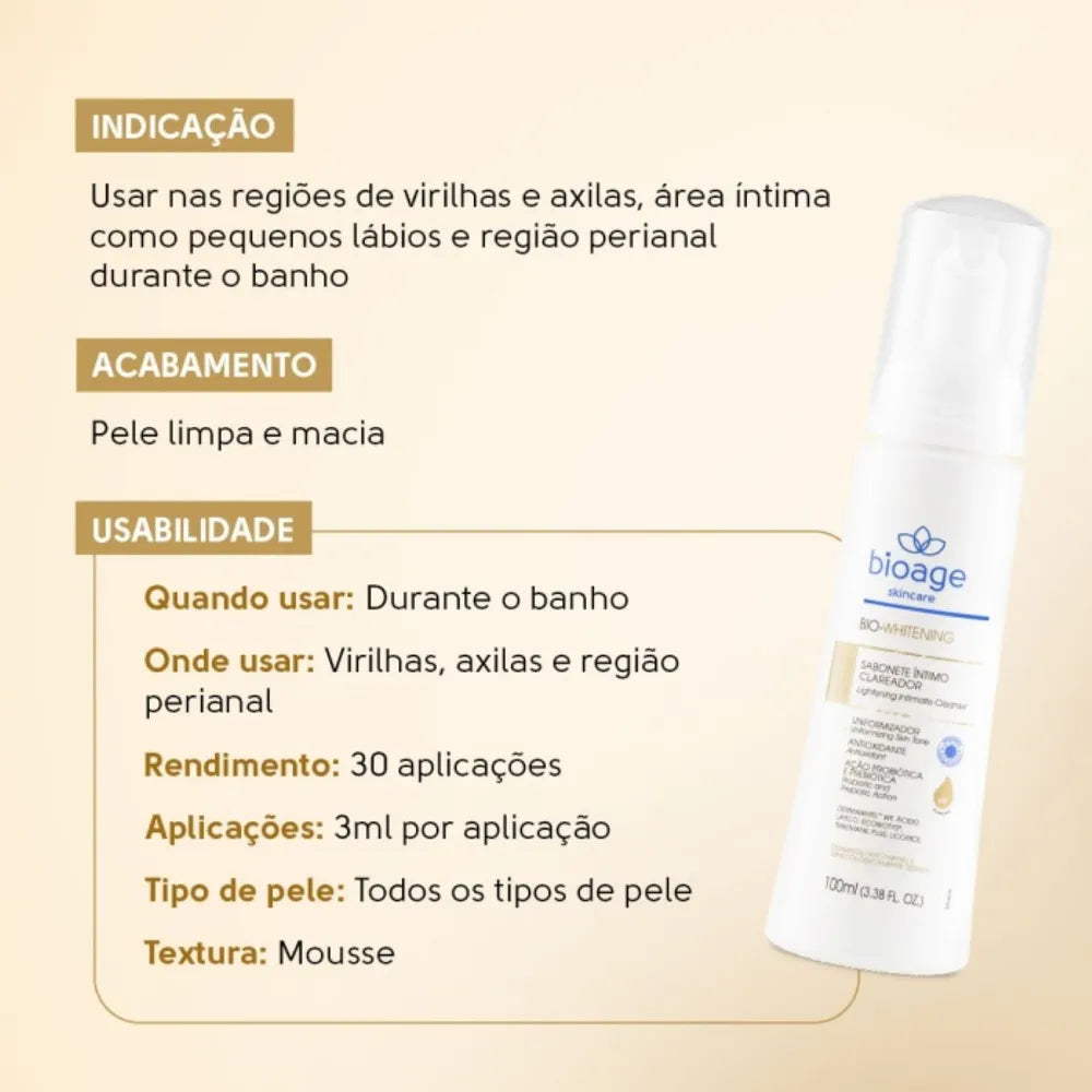 Sabonete clareador íntimo, limpeza equilibrada que desodoriza, acalma, refresca e auxilia no tratamento cosmético para rejuvenescer, clarear e uniformizar o tom da pele da região íntima, durante sua higiene. Sua formulação foi desenvolvida com a tecnologia clareamento inteligente, uma segunda geração da nanotecnologia, segura e eficaz, que atua isoladamente nas áreas afetadas pelos melanócitos, incidindo apenas sobre as áreas onde ocorre o excesso de melanina.