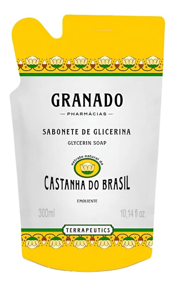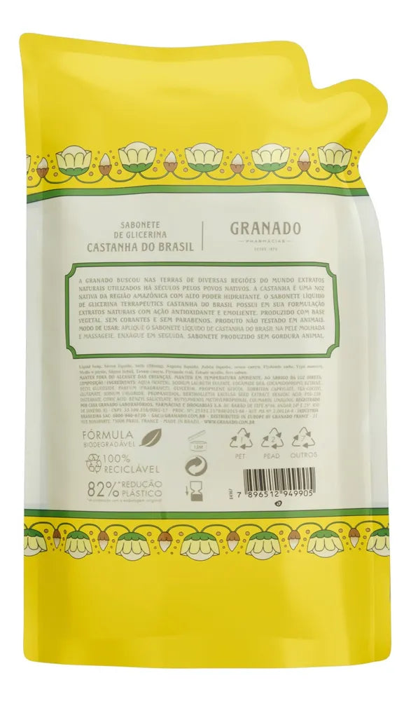 Refil de sabonete líquido, para todos os tipos de pele. Granado Terrapeutics Glicerina Castanha do Brasil limpa delicadamente, proporcionando hidratação, maciez e toque aveludado.