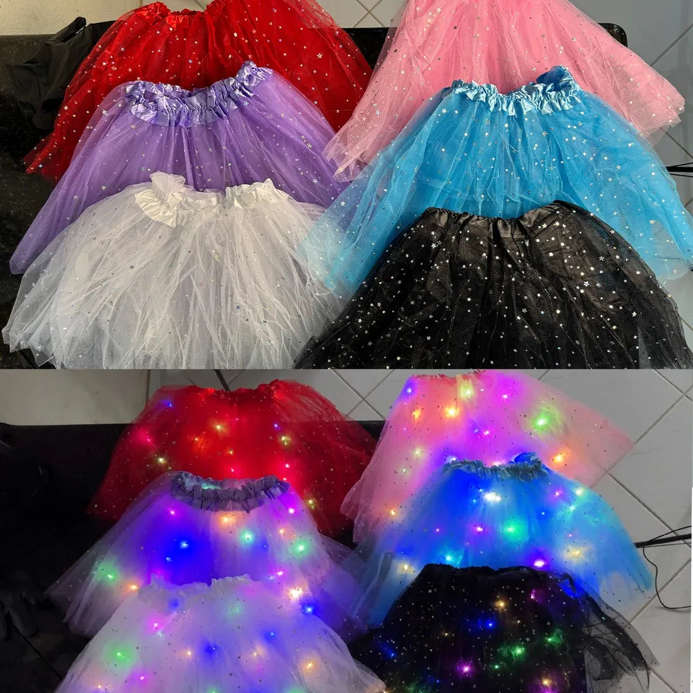 - A Saia de Tule é uma ótima opção no momento de criar uma fantasia para sua festa e sendo super versáteis criando fantasias diferentes com pequenos detalhes que são mudados nelas inclusive ela fica ainda mais divertida com Led colorido que vem incluso dentro da saia. O Led fica localizado em um local bem discreto com botão de liga e desliga.