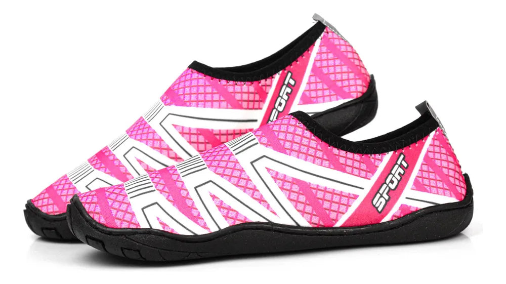 A sapatilha é feita de material Neoprene (spandex), o que ajuda para uma secagem rápida e boa ventilação. Um material altamente resistente, leve e totalmente ajustável aos pés, perfeito para todos os tipos de terreno e até mesmo para natação e mergulho.