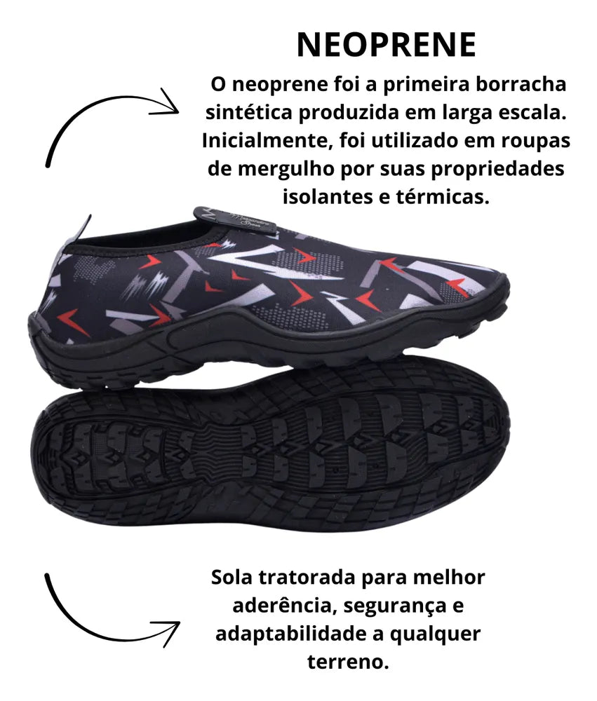 A sapatilha é feita de material NEOPRENE, o que ajuda para uma secagem rápida e boa ventilação. Um material altamente resistente, leve e totalmente ajustável, perfeito para todos os tipos de terreno e até mesmo para natação e mergulho.