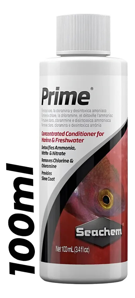 Seachem Prime é utilizado para o tratamento de água, auxiliando na desintoxicação completa dos metais pesados e tóxicos encontrados na água da torneira. Prime é um condicionador completo e concentrado para água doce e salgada. Remove cloro, cloramina e neutraliza amônia, convertendo a amônia em uma forma segura e não tóxica que é facilmente removida pelo biofiltro do aquário.