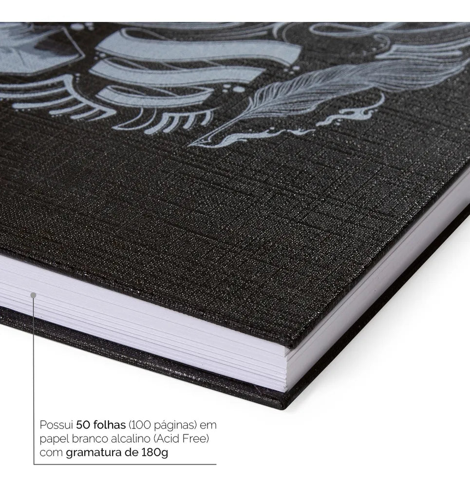 Na medida de 20x29,7cm (A4), ele possui 50 folhas (100 páginas) em papel branco alcalino (acid free) e gramatura de 180g/m². As folhas internas possuem espessura ideal para desenvolver desenhos com lápis de cor, pastel, caneta, tinta guache e até nanquim!